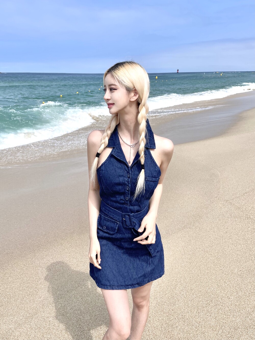 홀터넥 디자인의 데님 미니 원피스