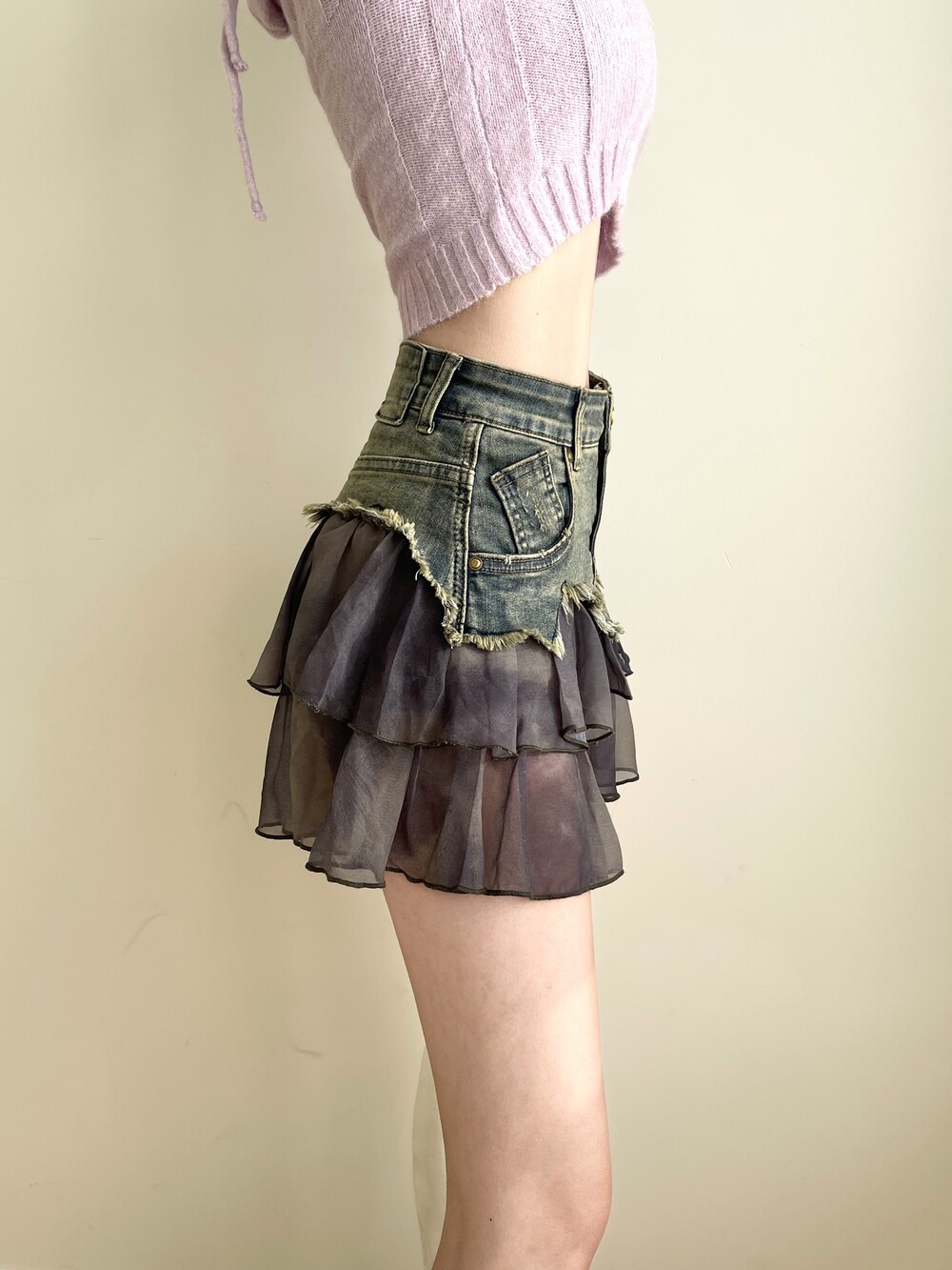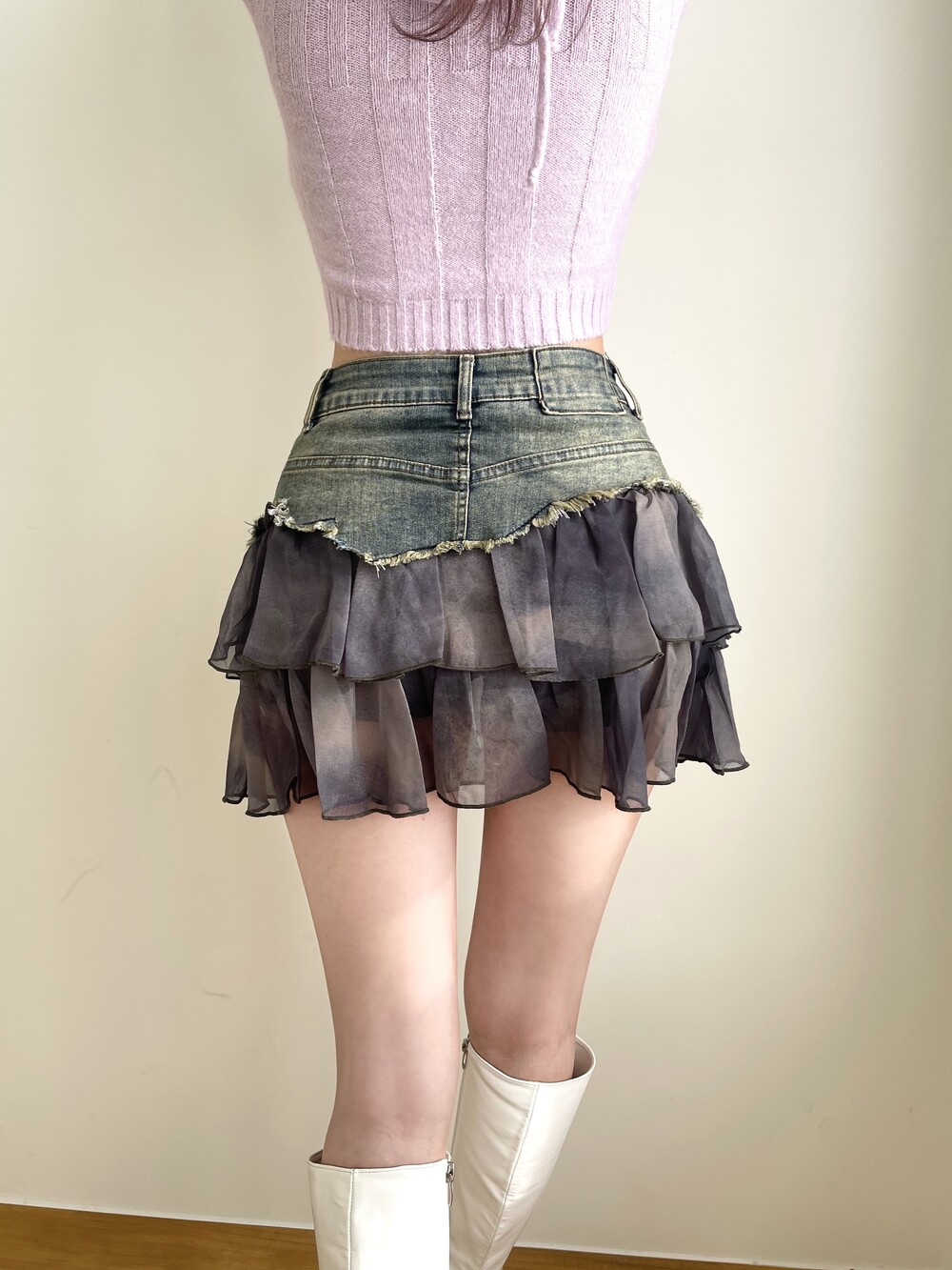 데님 데미지 라인에 캉캉 프릴 스커트가 믹싱된 디자인