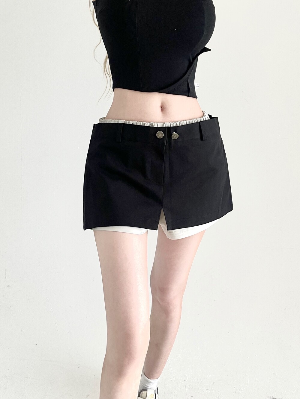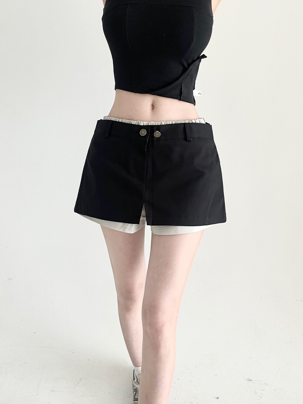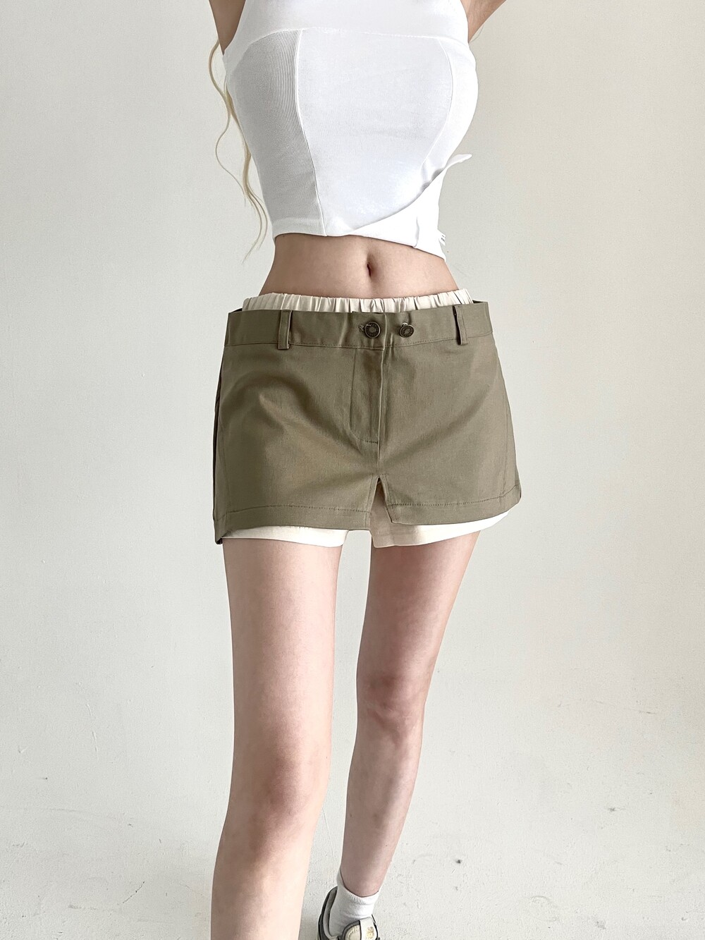 밴딩 쇼츠 위에 슬릿 스커트를 레이어드한 듯 한 디자인의 숏팬츠