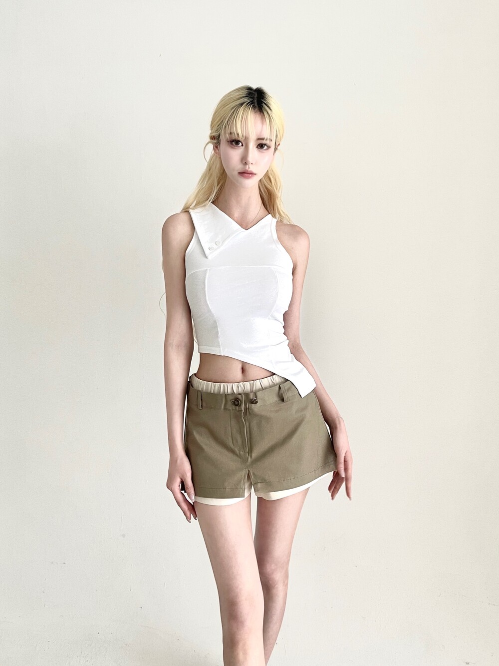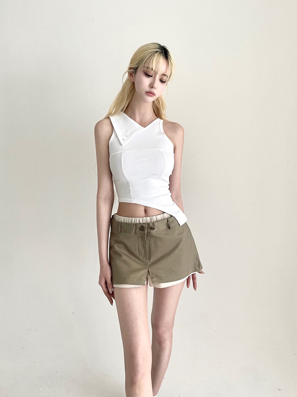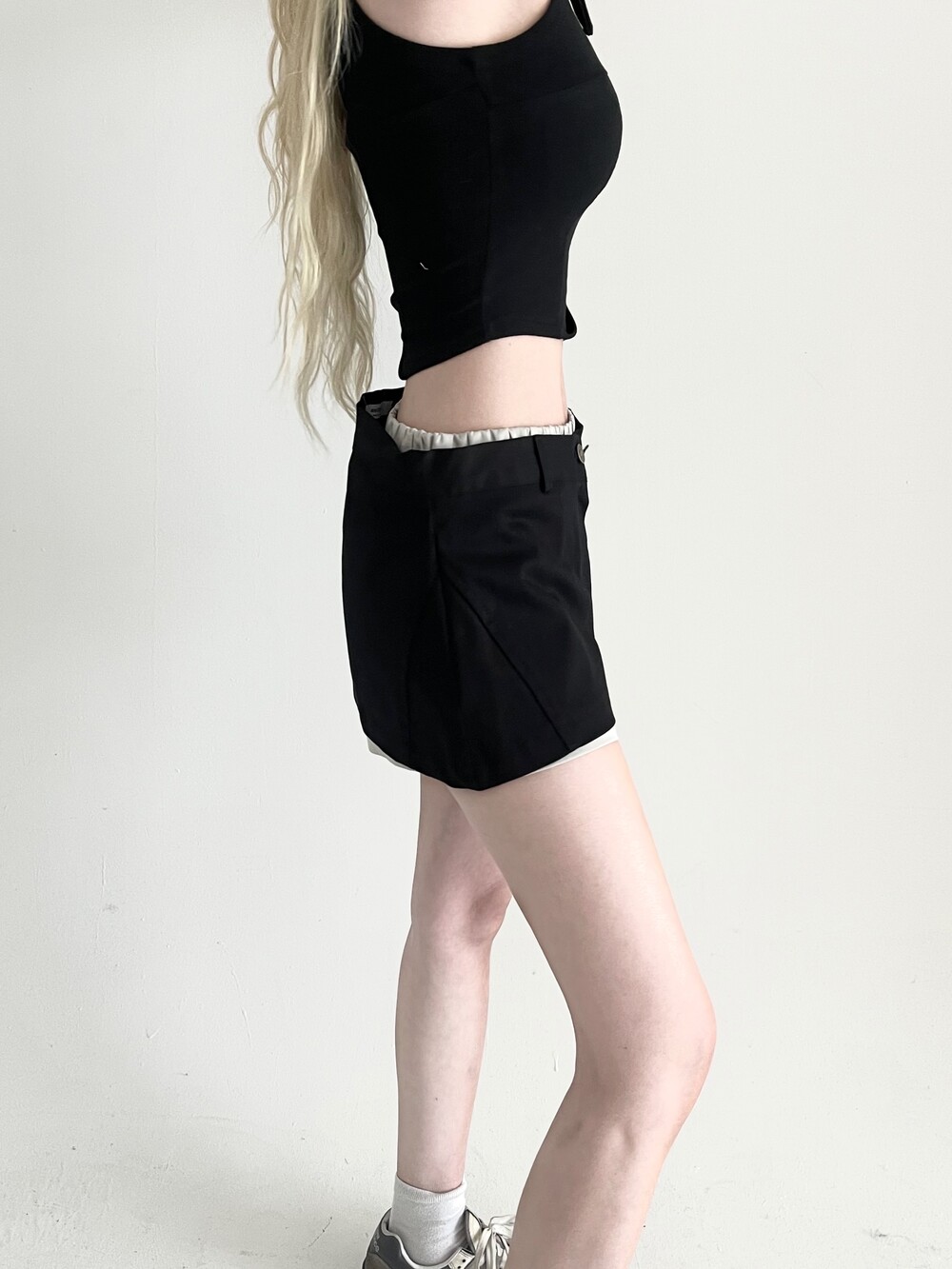 밴딩 쇼츠 위에 슬릿 스커트를 레이어드한 듯 한 디자인의 숏팬츠