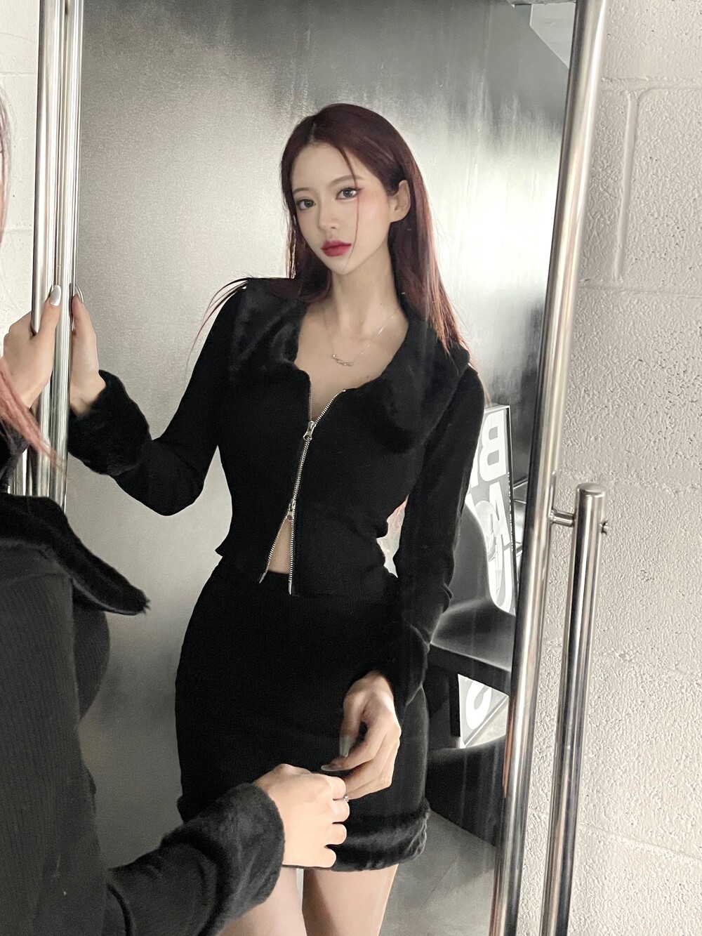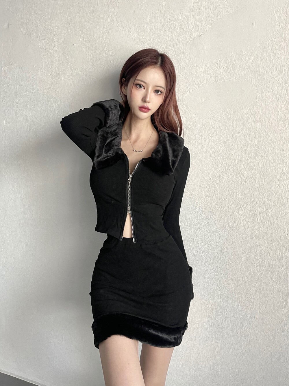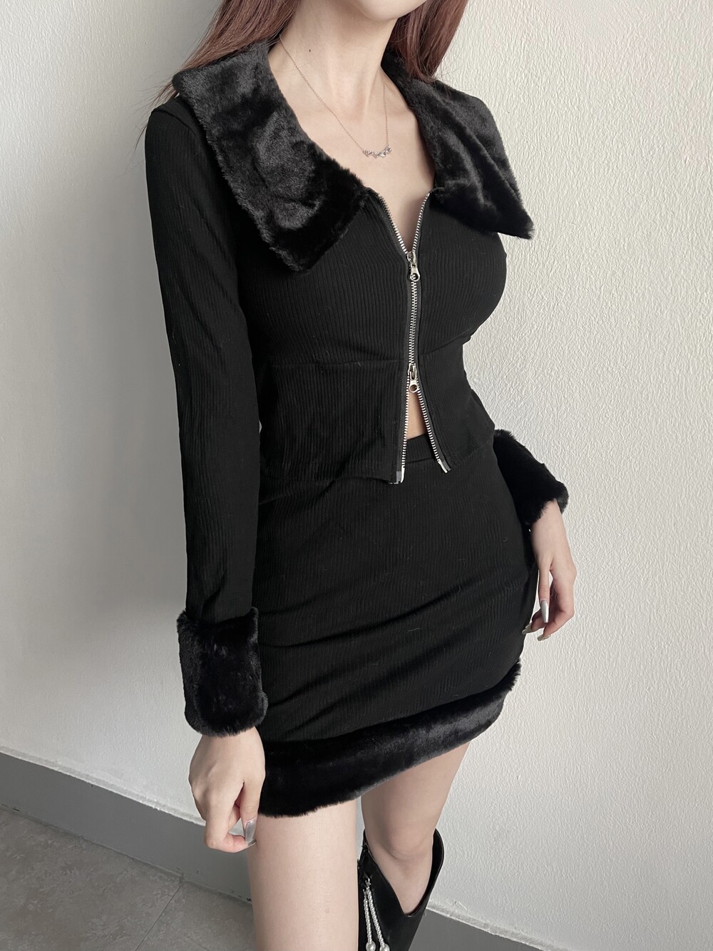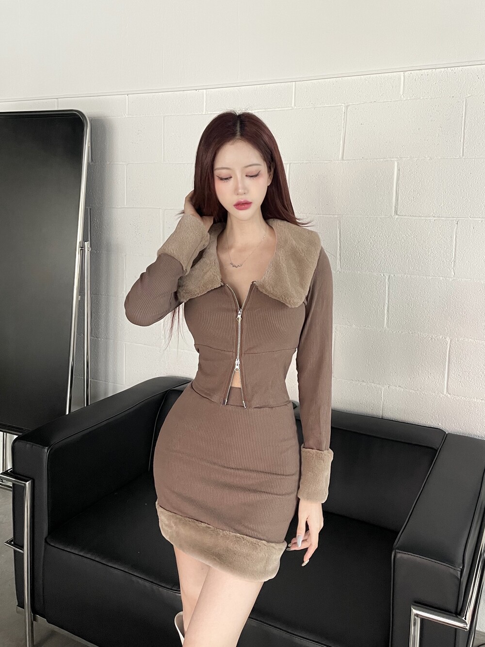 밍크 카라 집업 크롭 가디건 - 밍크 미니 스커트 2pc set