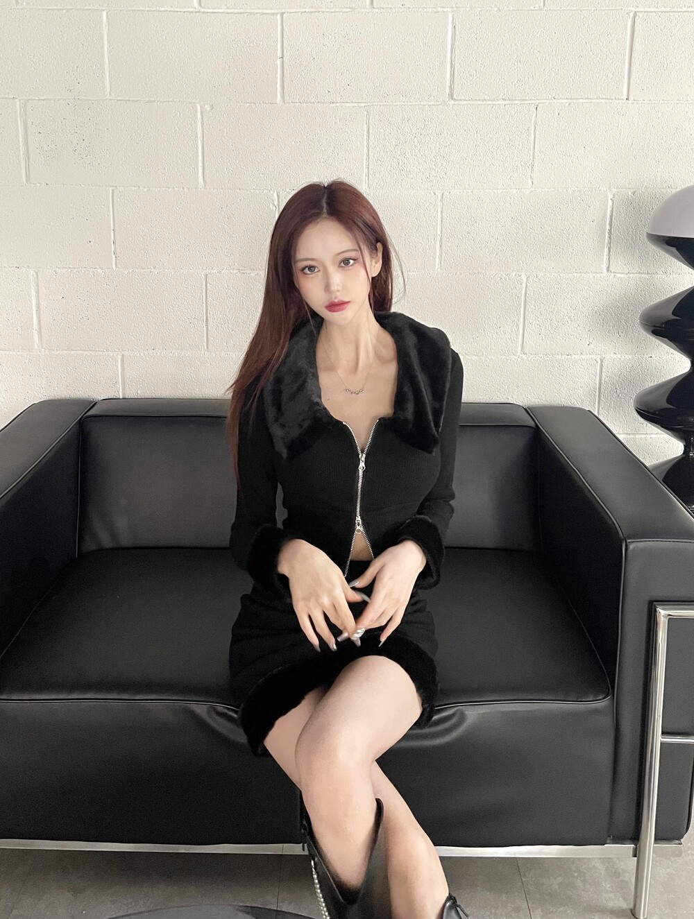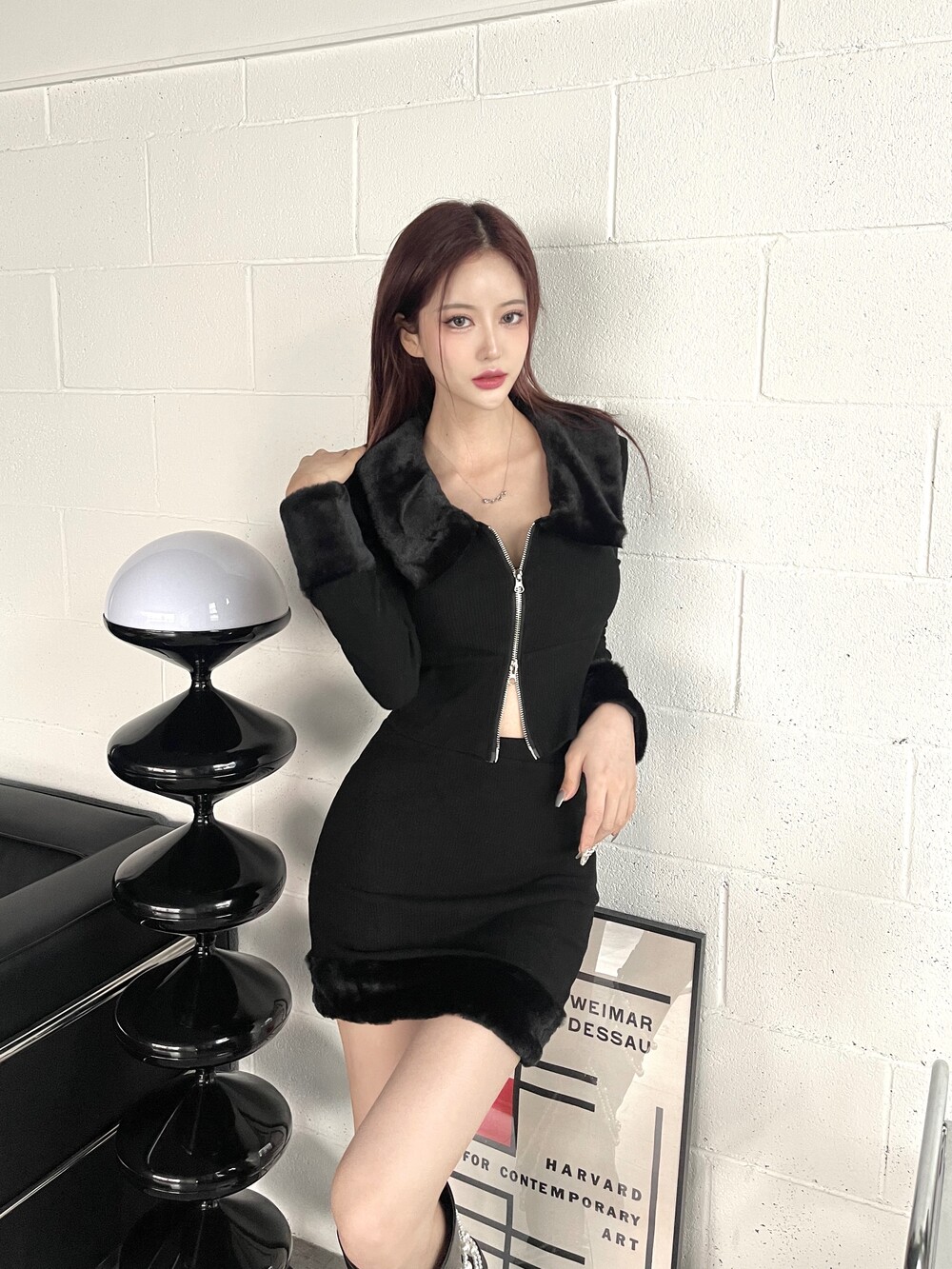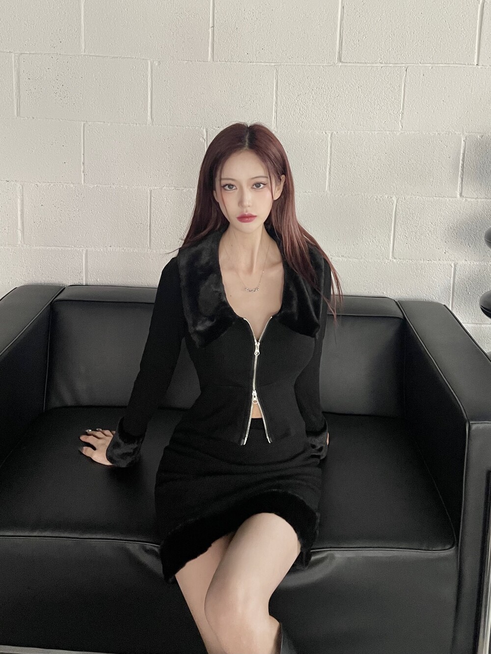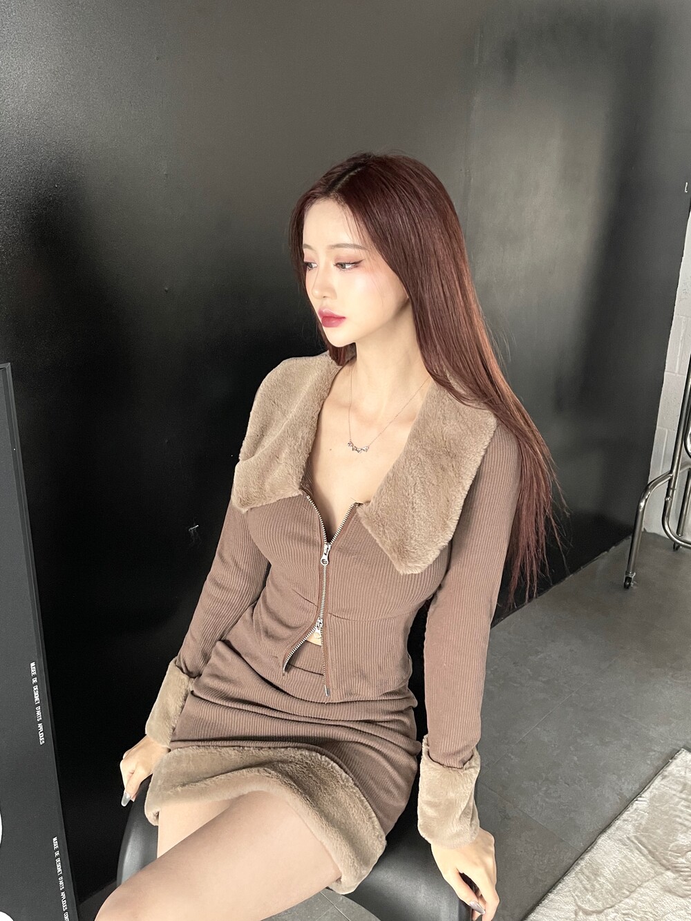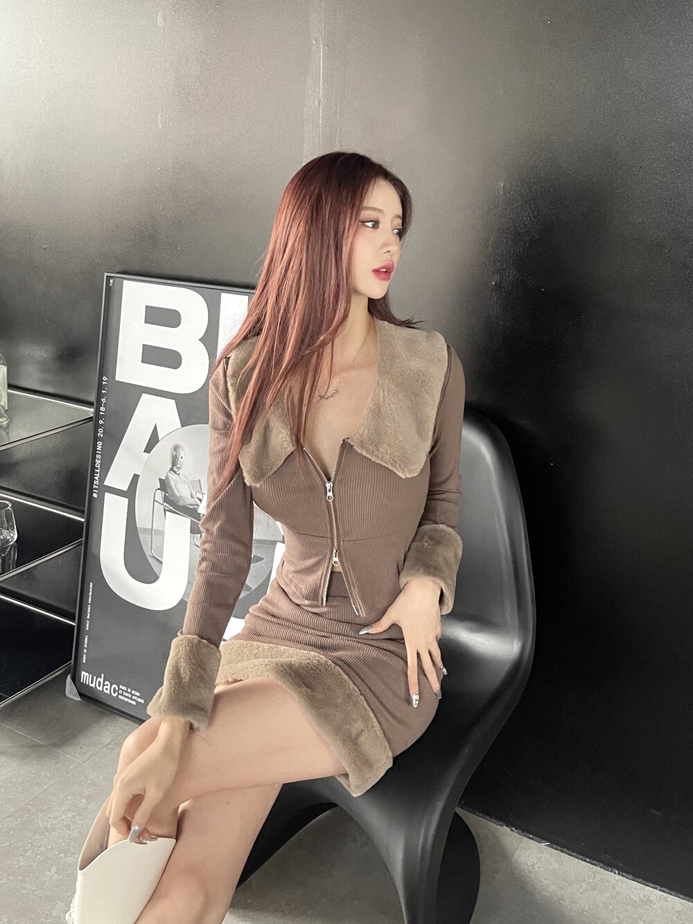 키치하면서 힙한 무드의 밍크 카라 투피스
