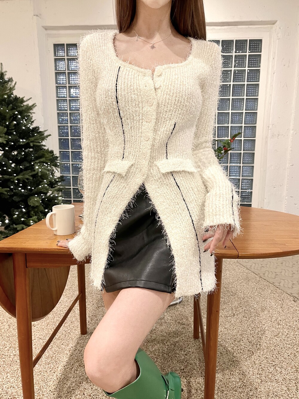 배색 라인으로 포인트를 준 도톰한 가디건 원피스