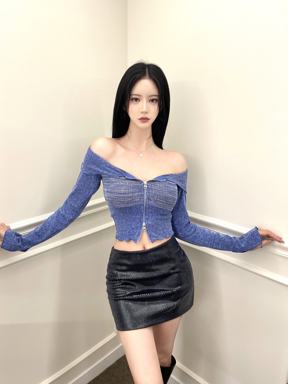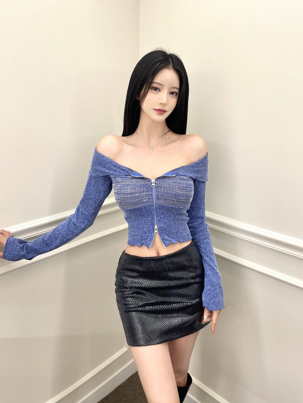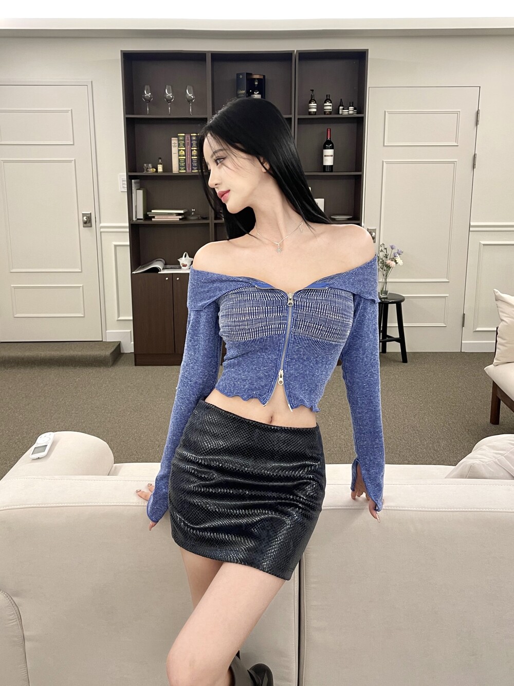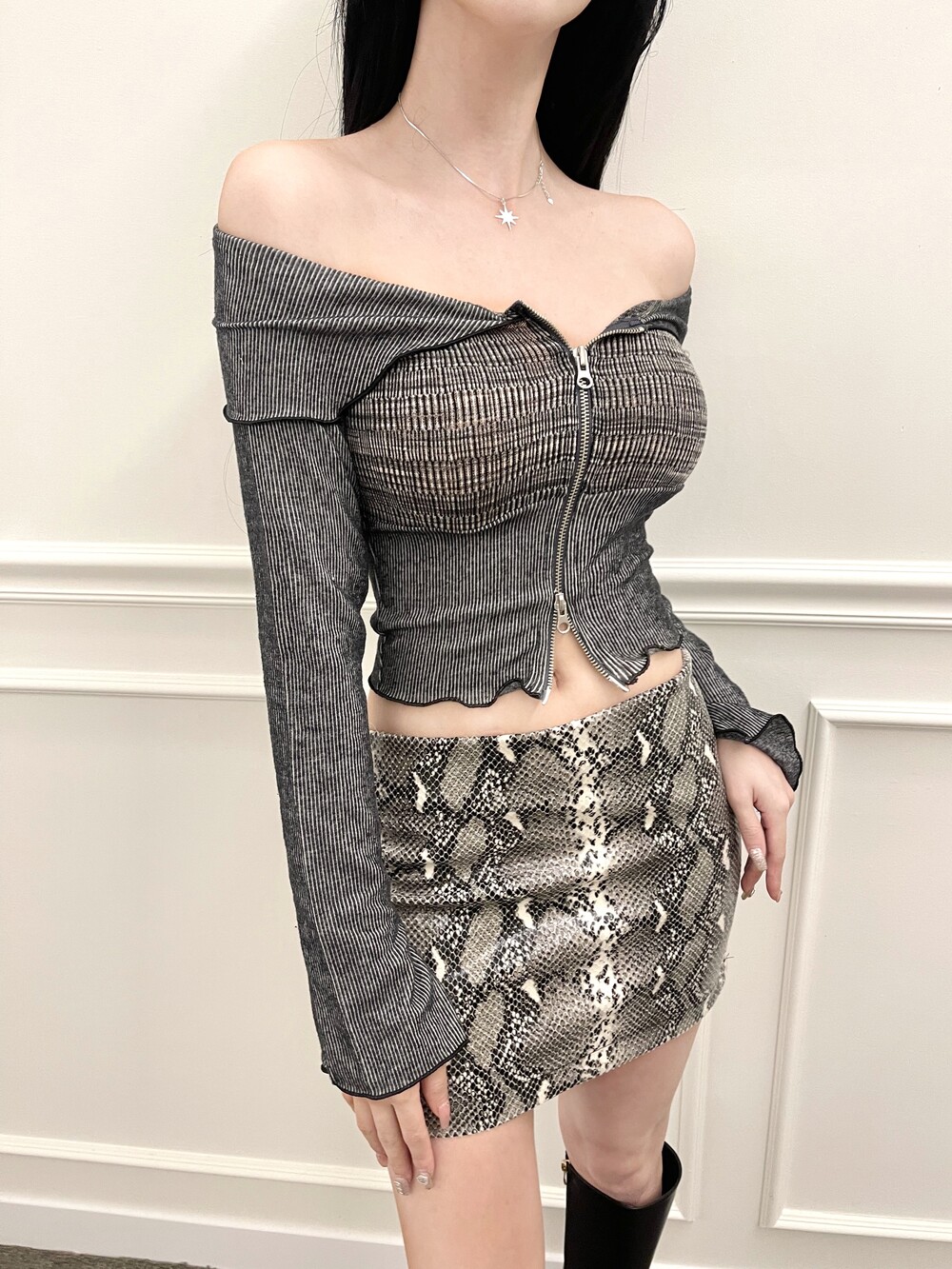오프숄더 배색 크롭 투웨이 집업