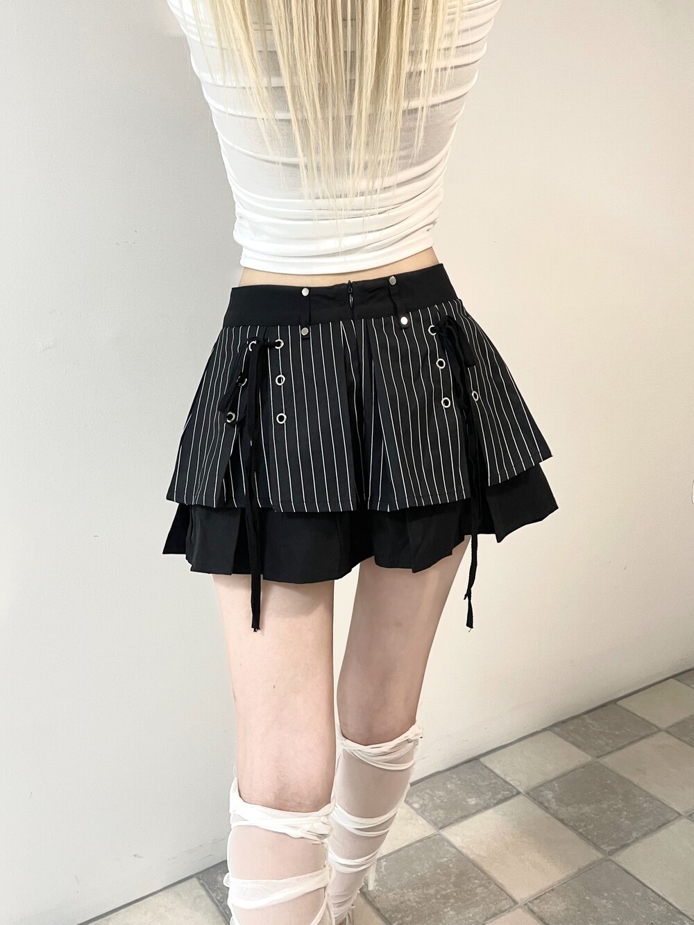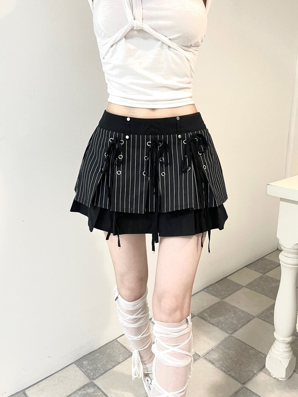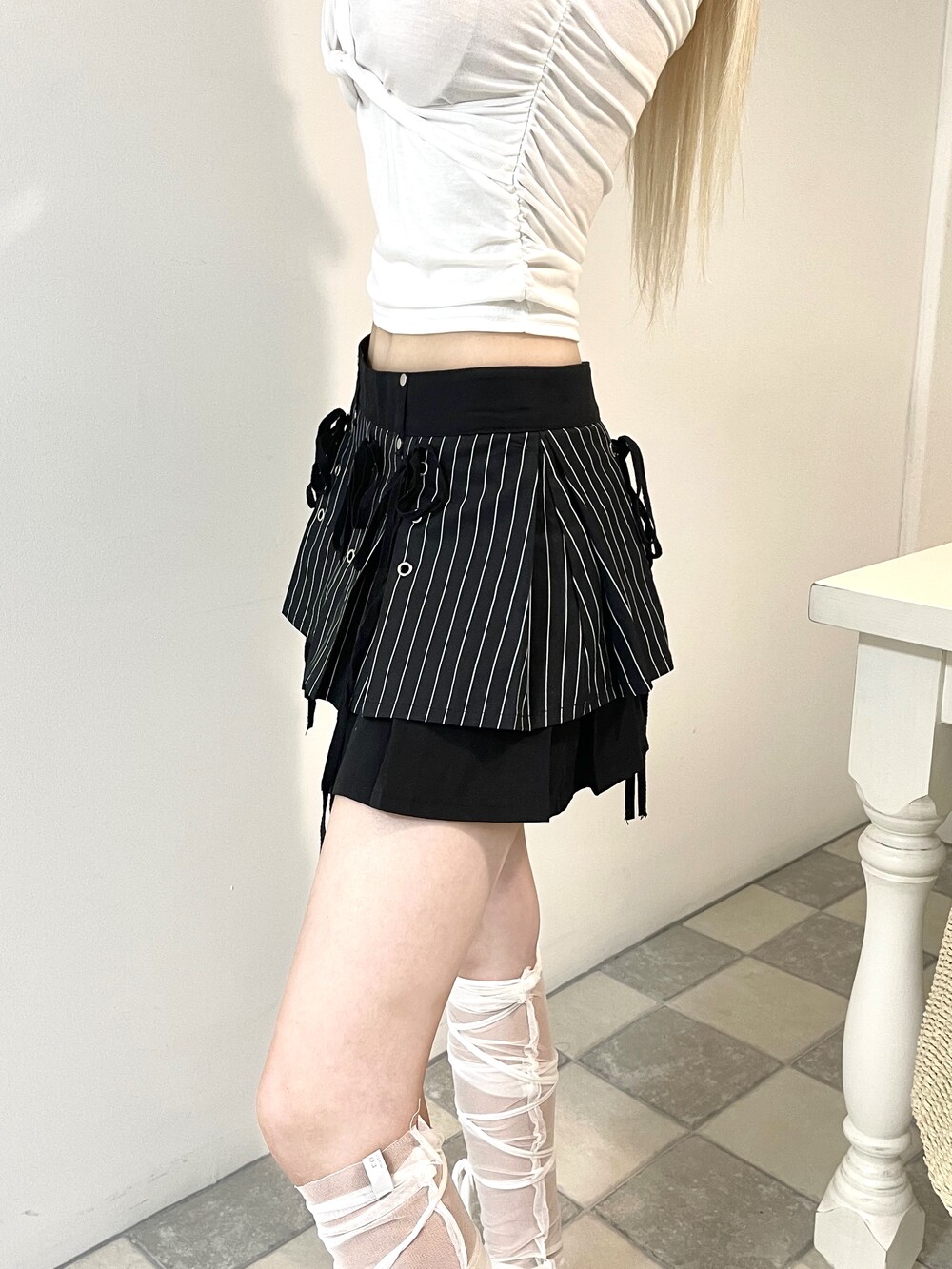 스트라이프 레이어드 리본 플리츠 미니 스커트