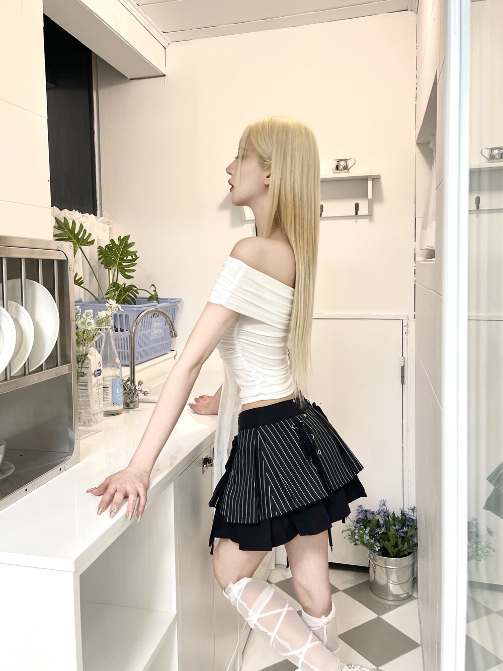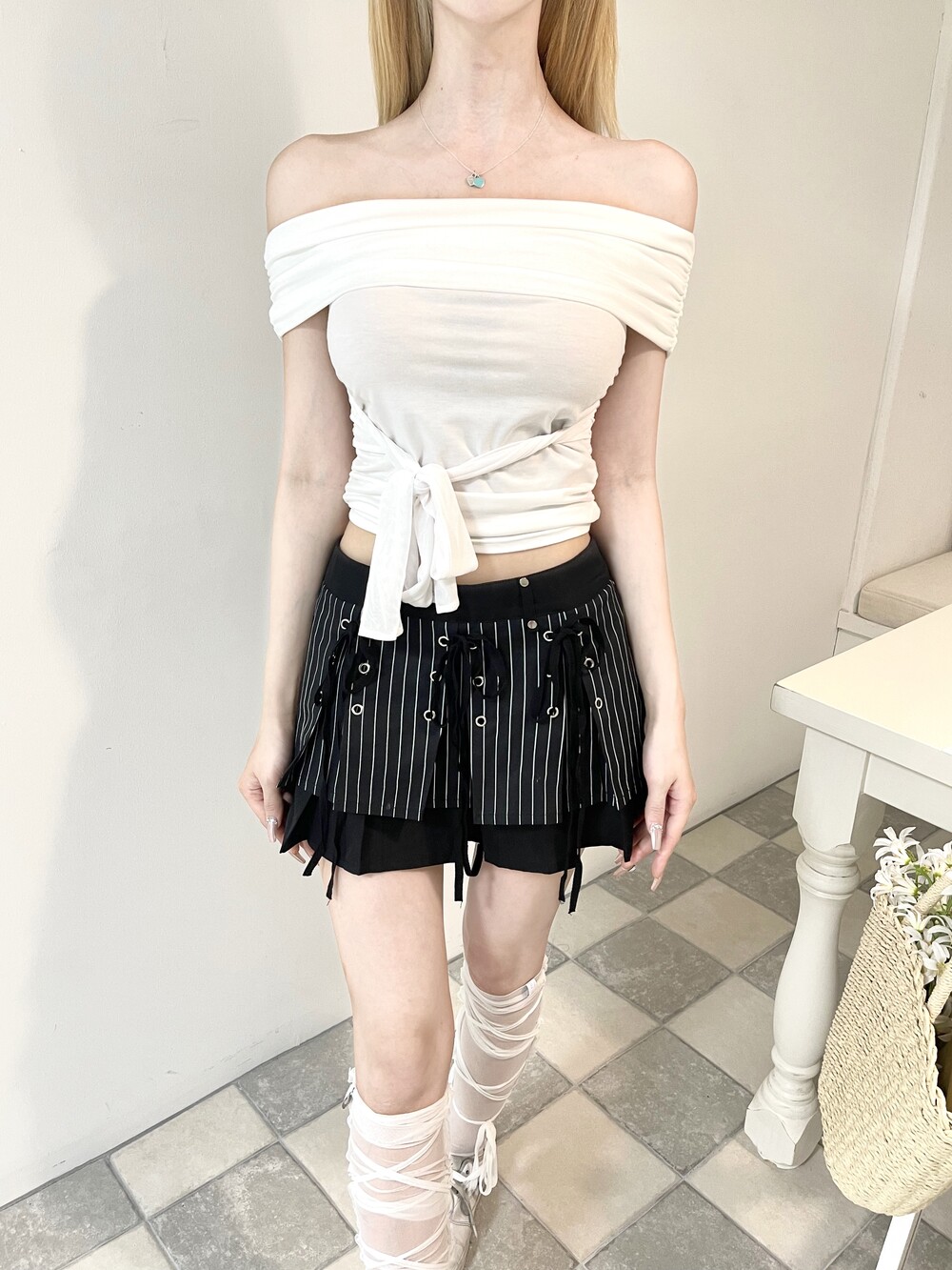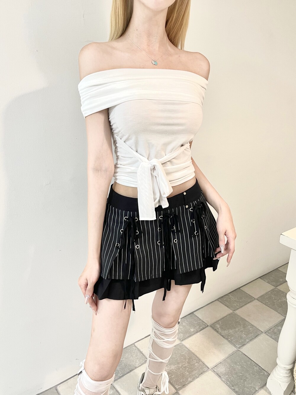 스트라이프 레이어드 리본 플리츠 미니 스커트