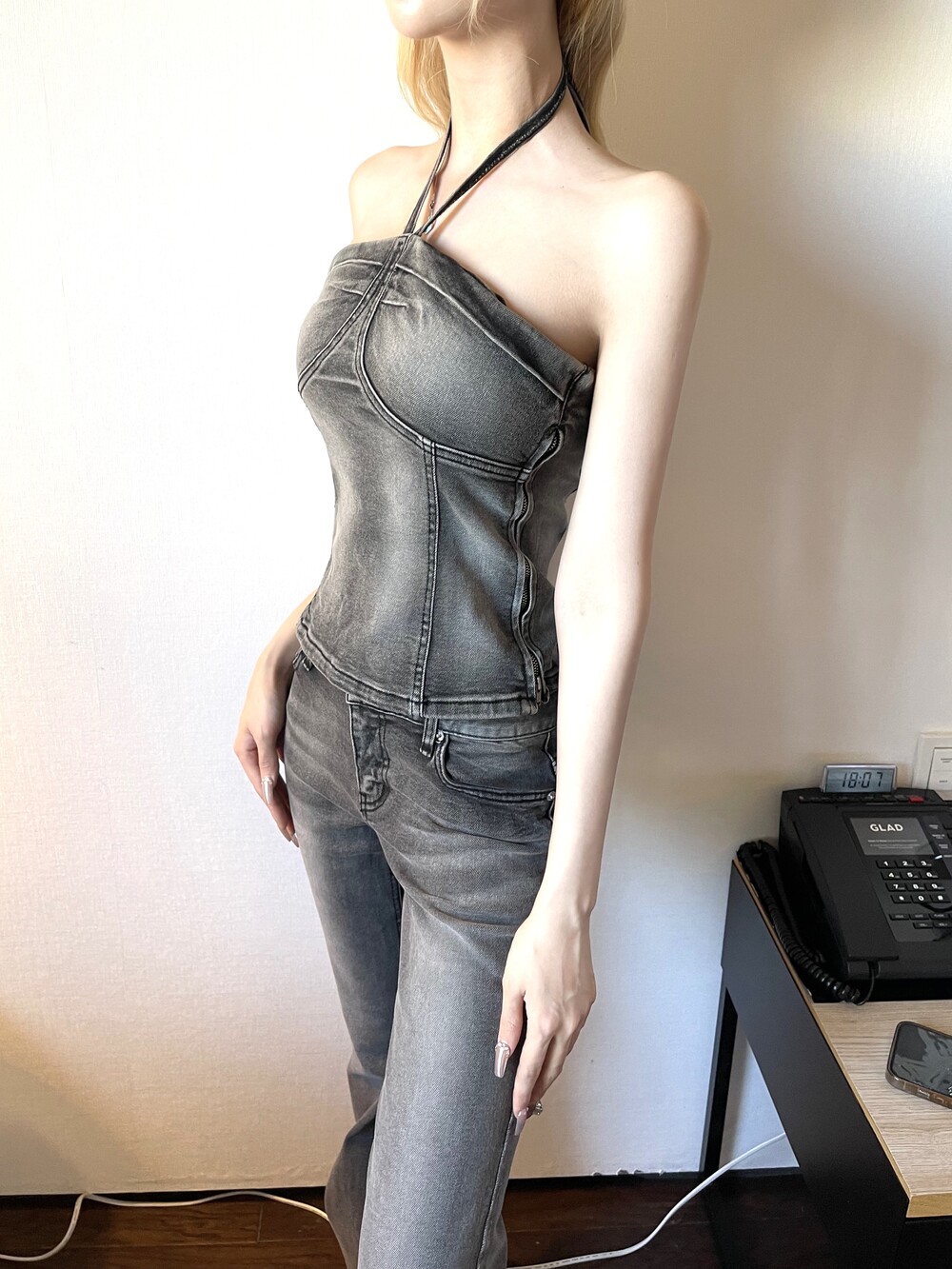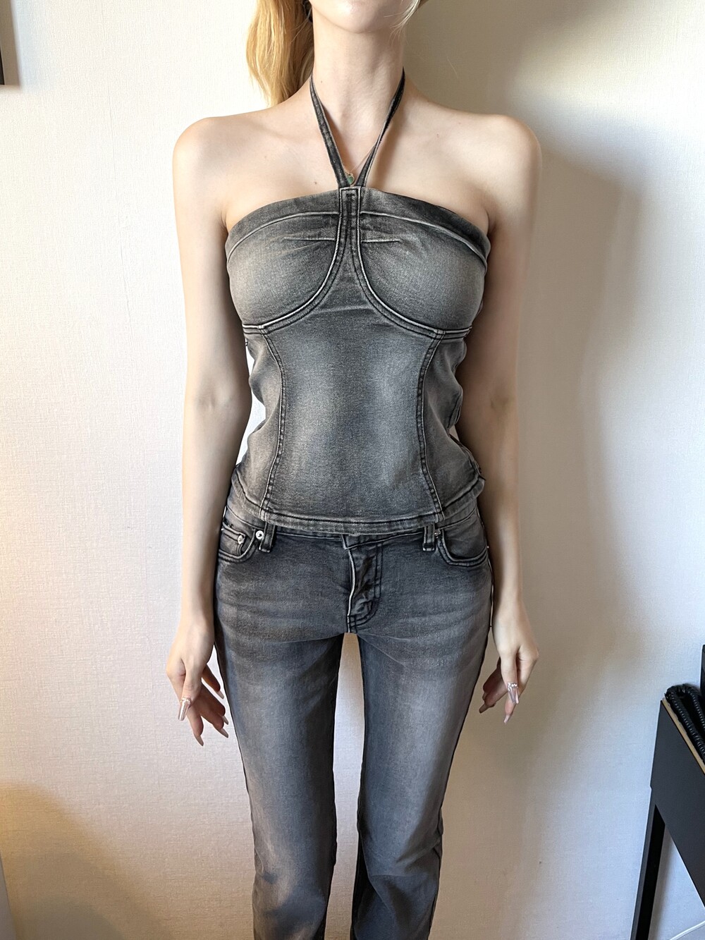 그레이 워싱 데님 캐미솔 홀터 탑