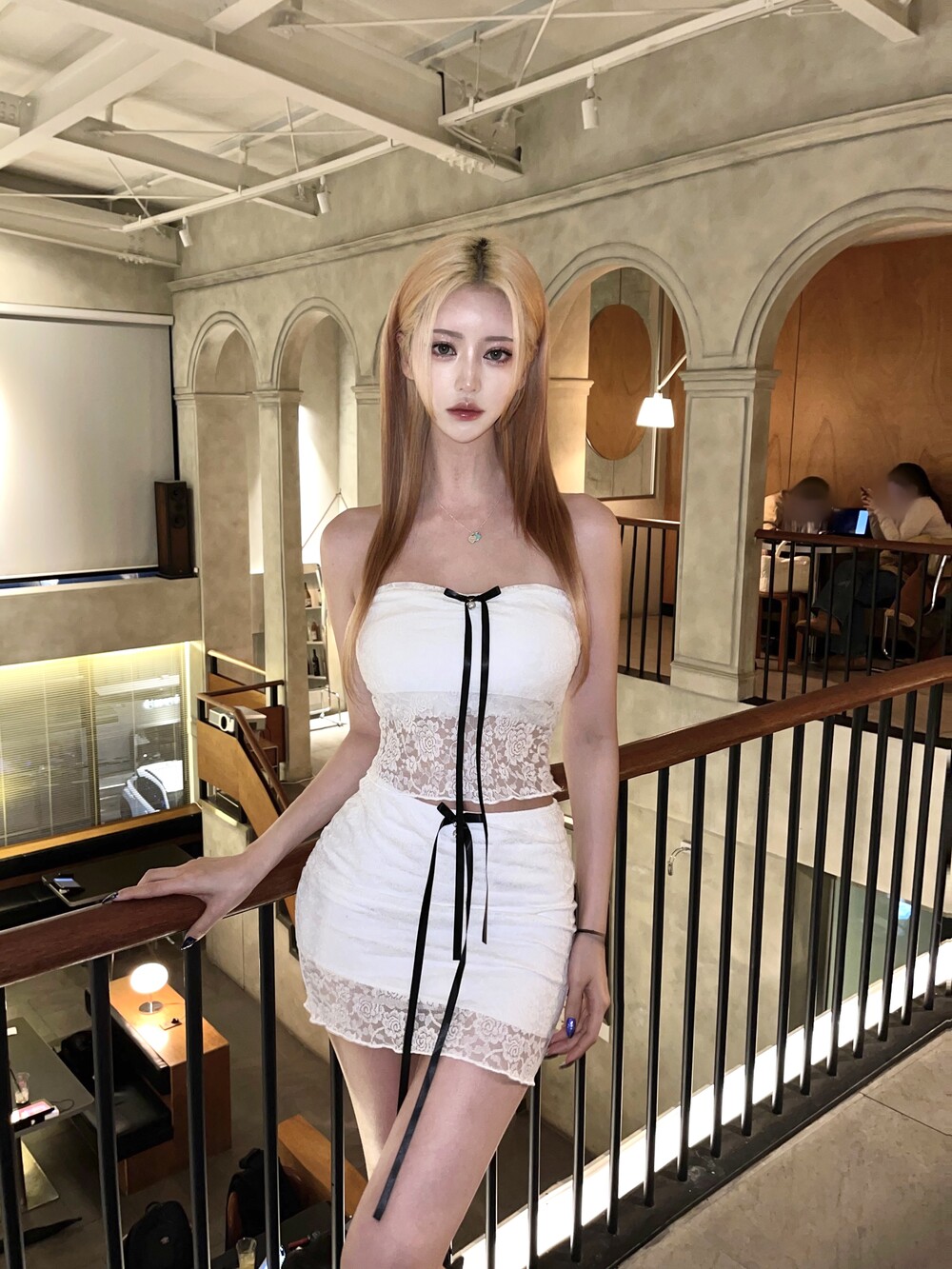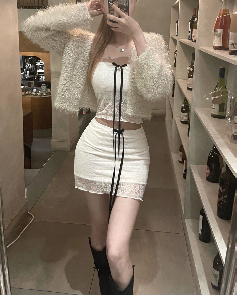 벨 리본 레이스 탑 - 미니 스커트 세트