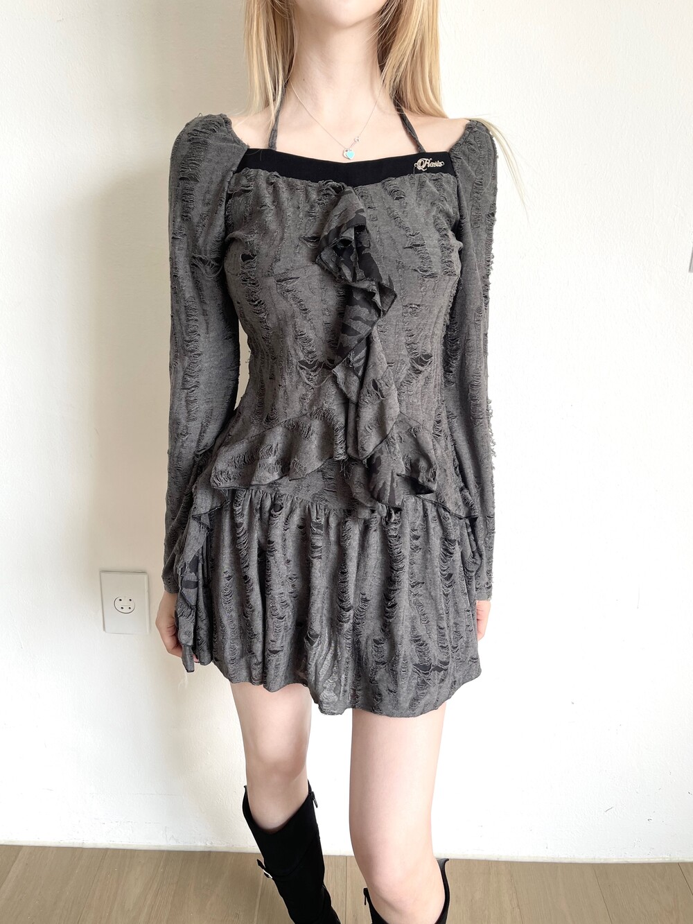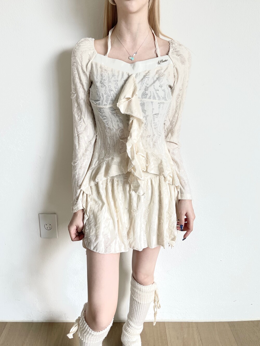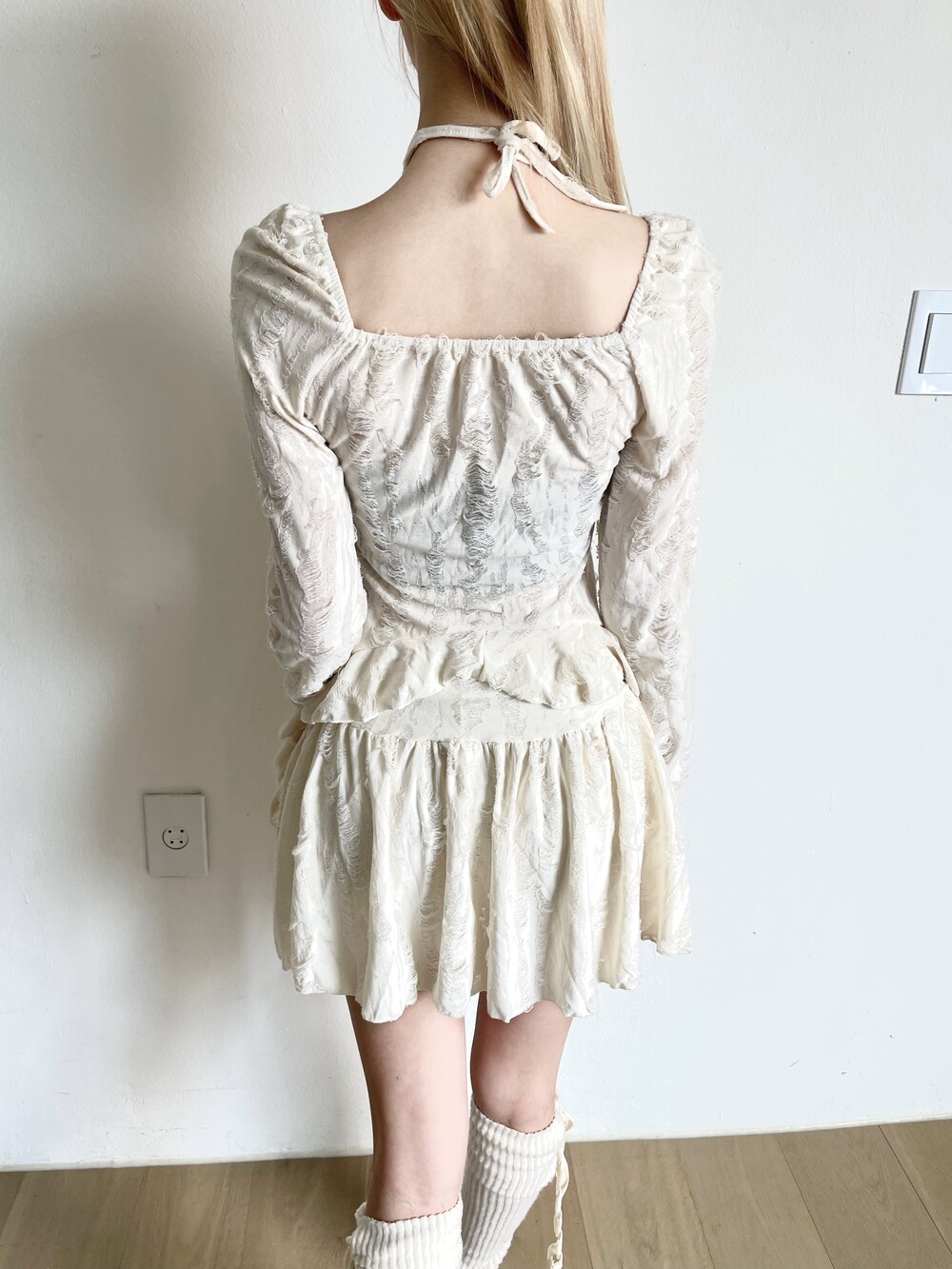 데미지 빈티지 홀터 블라우스 - 데미지 빈티지 미니 스커트 세트