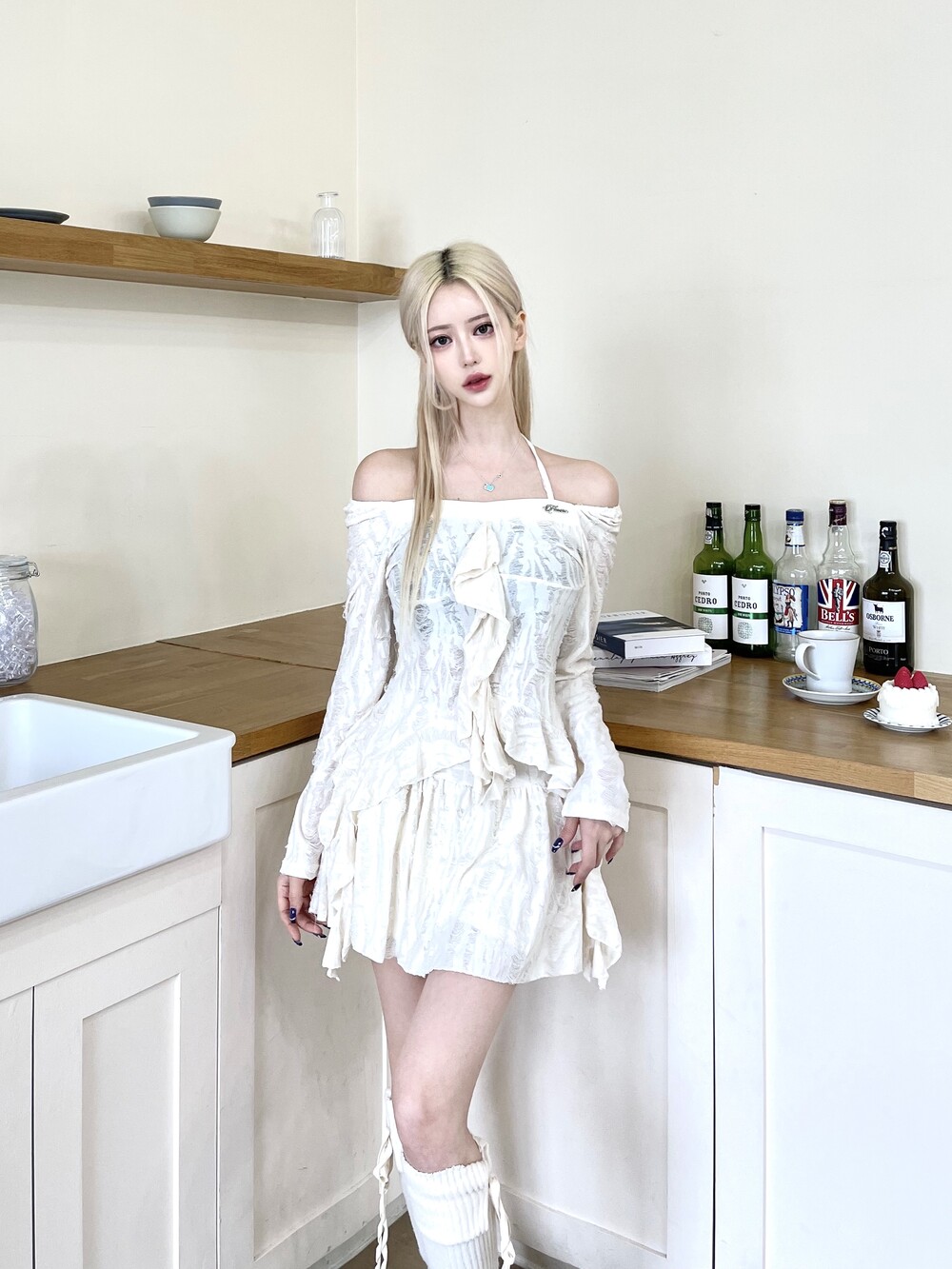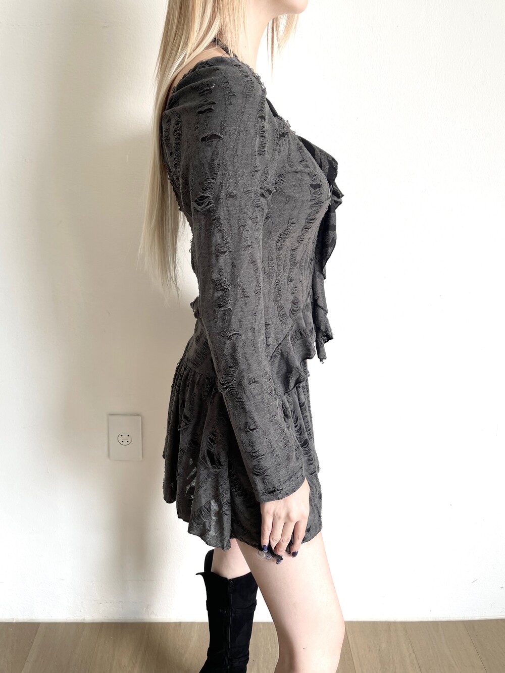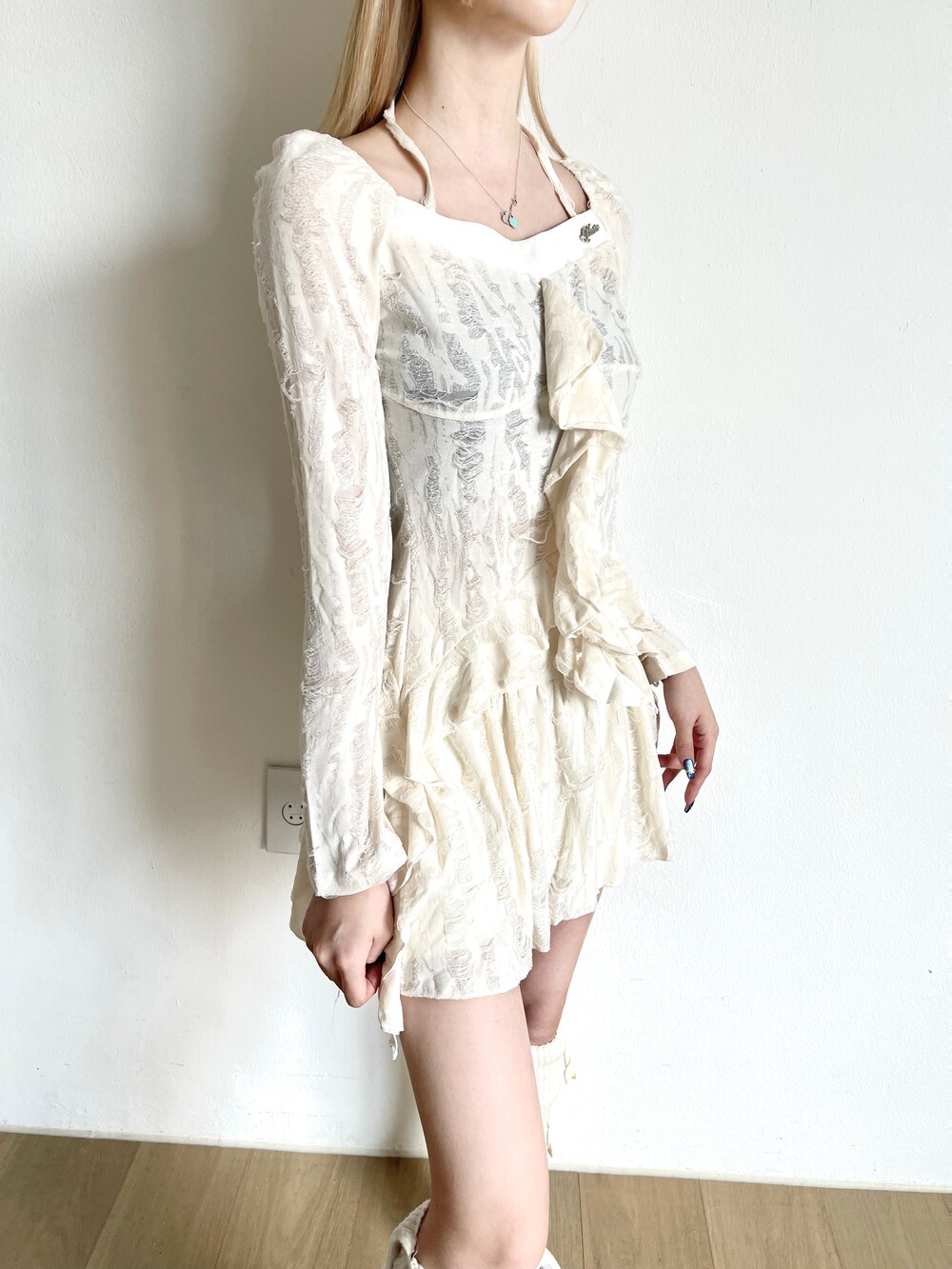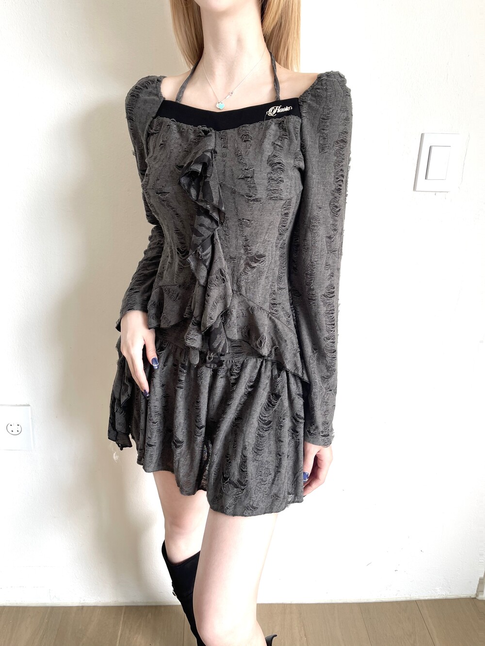 데미지 빈티지 홀터 블라우스 - 데미지 빈티지 미니 스커트 세트