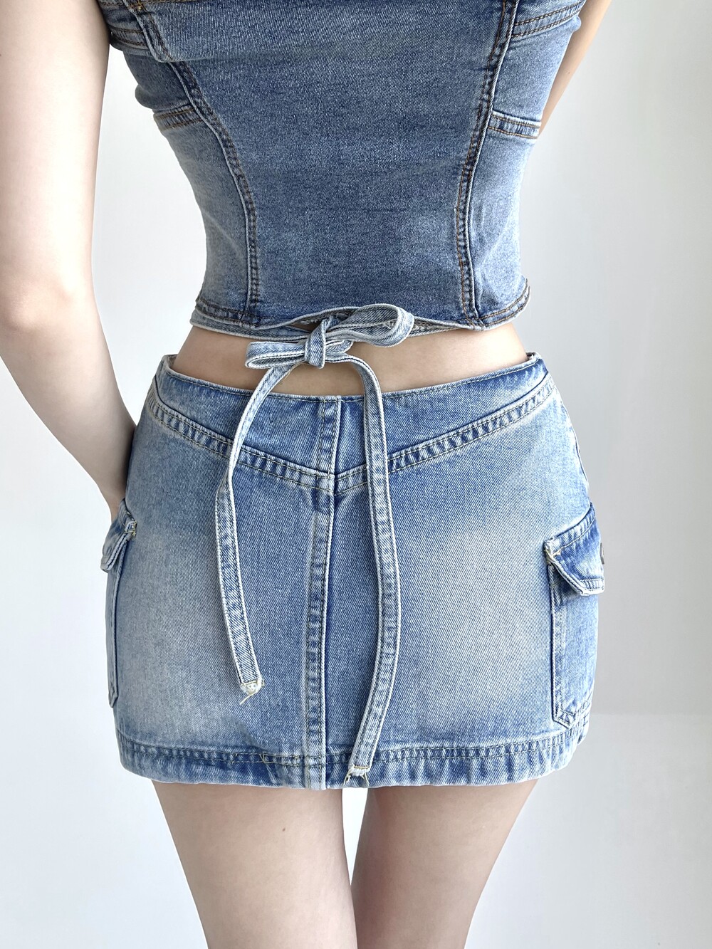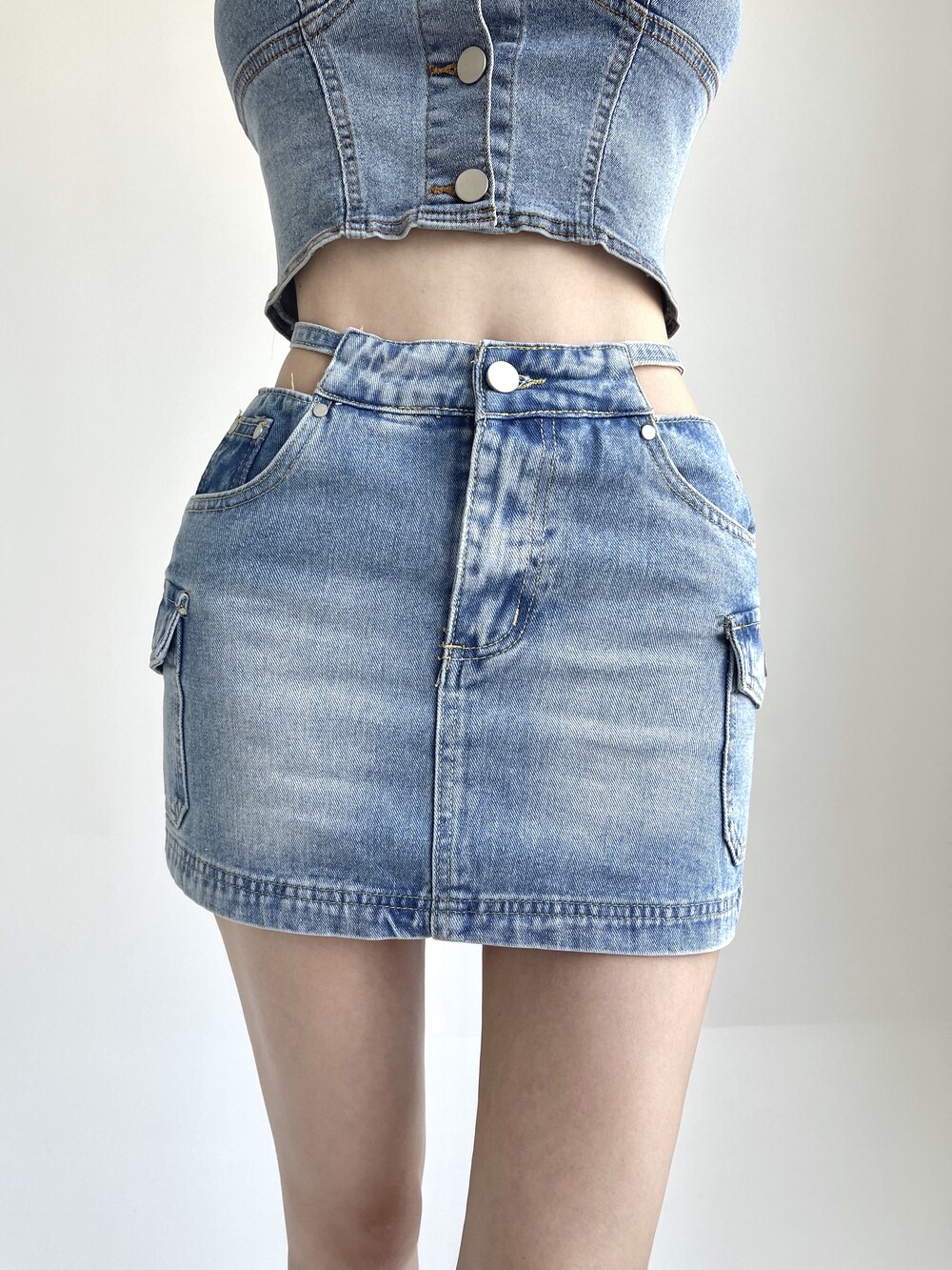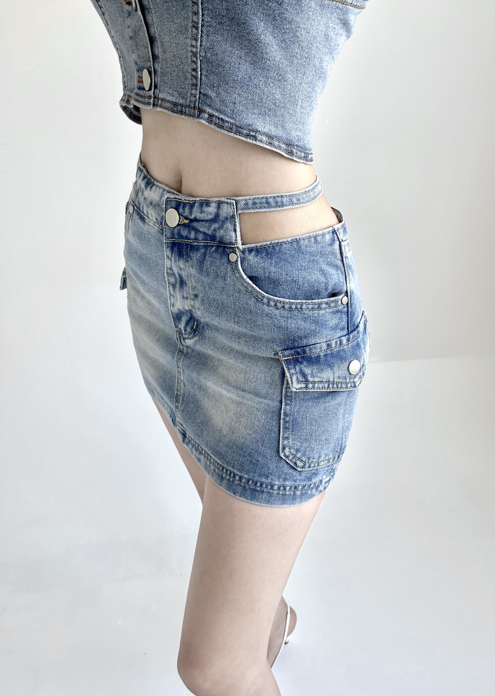 허리끈 스트랩 카고 미니 데님 스커트