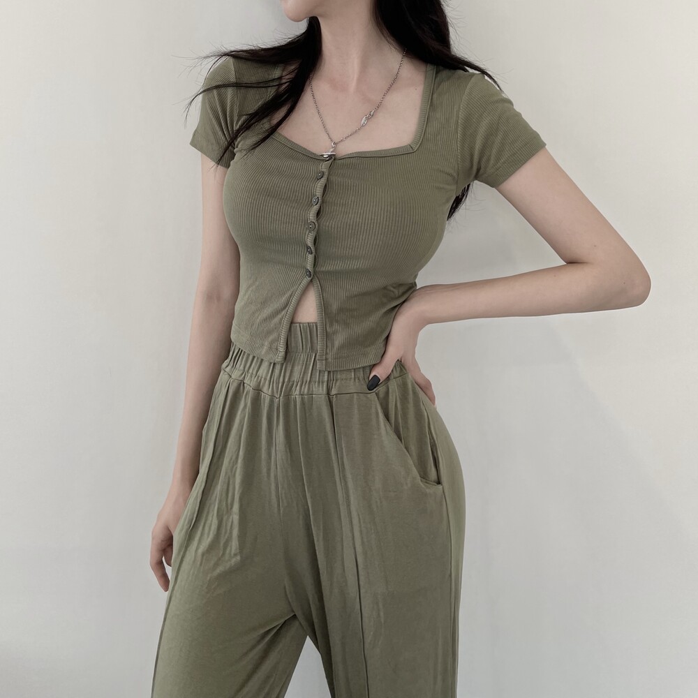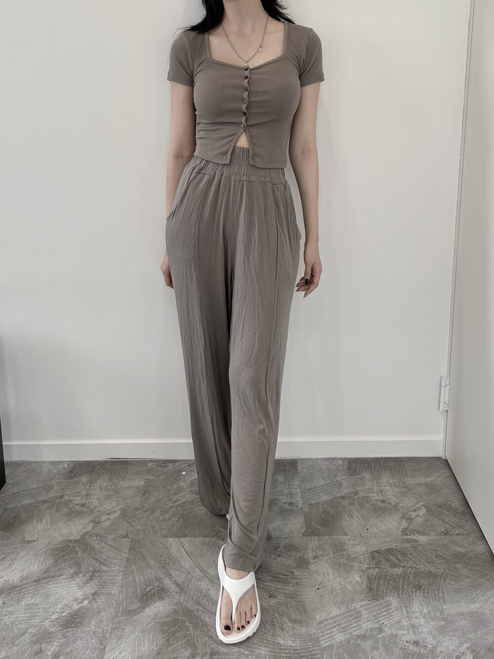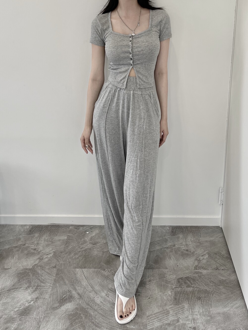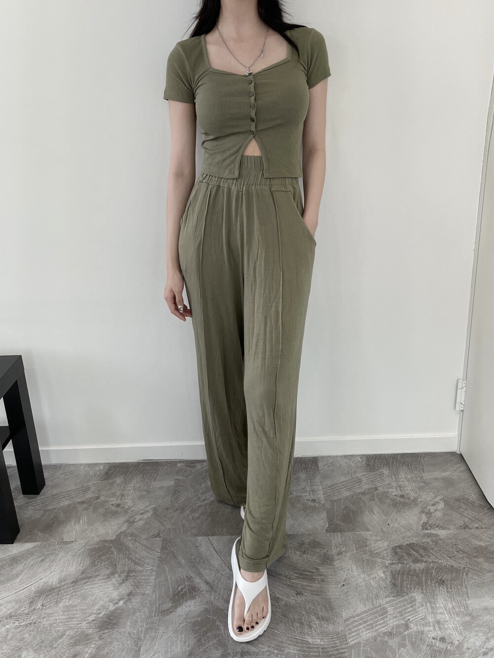 상의는 스퀘어넥, 버튼, 트임 디테일로 포인트를 줬고 하의는 찰랑이는 맥시 디자인으로 세트매치