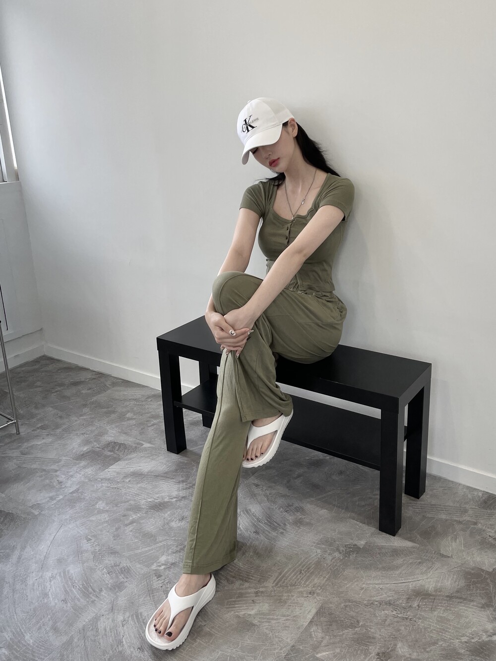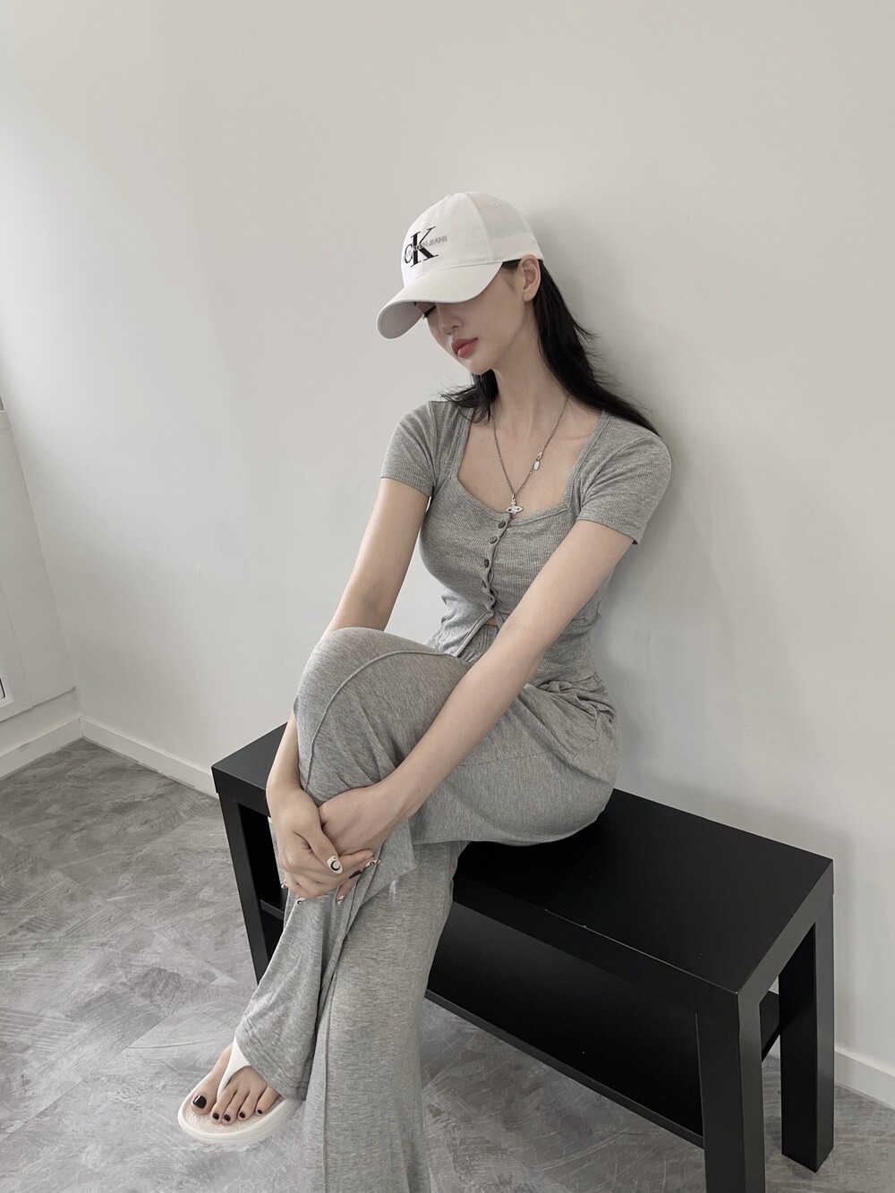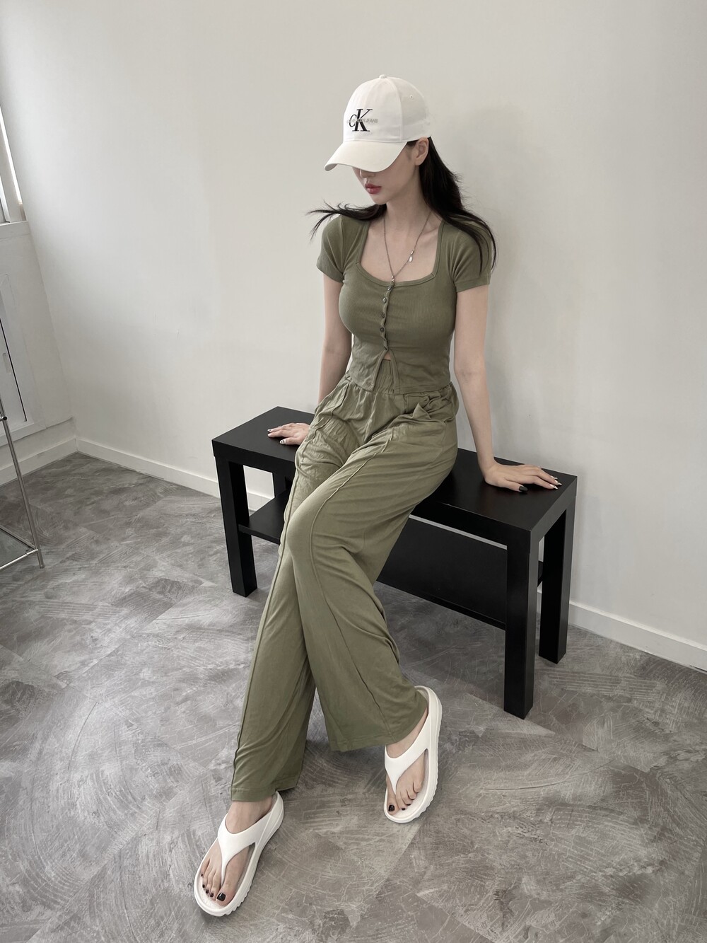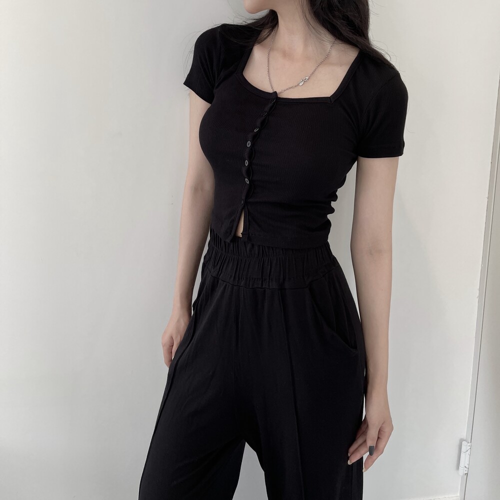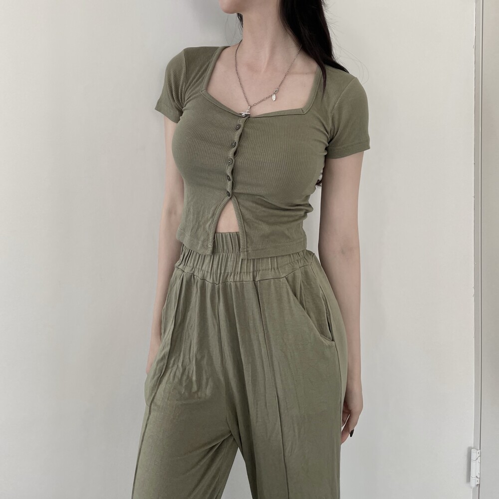 상의는 스퀘어넥, 버튼, 트임 디테일로 포인트를 줬고 하의는 찰랑이는 맥시 디자인으로 세트매치