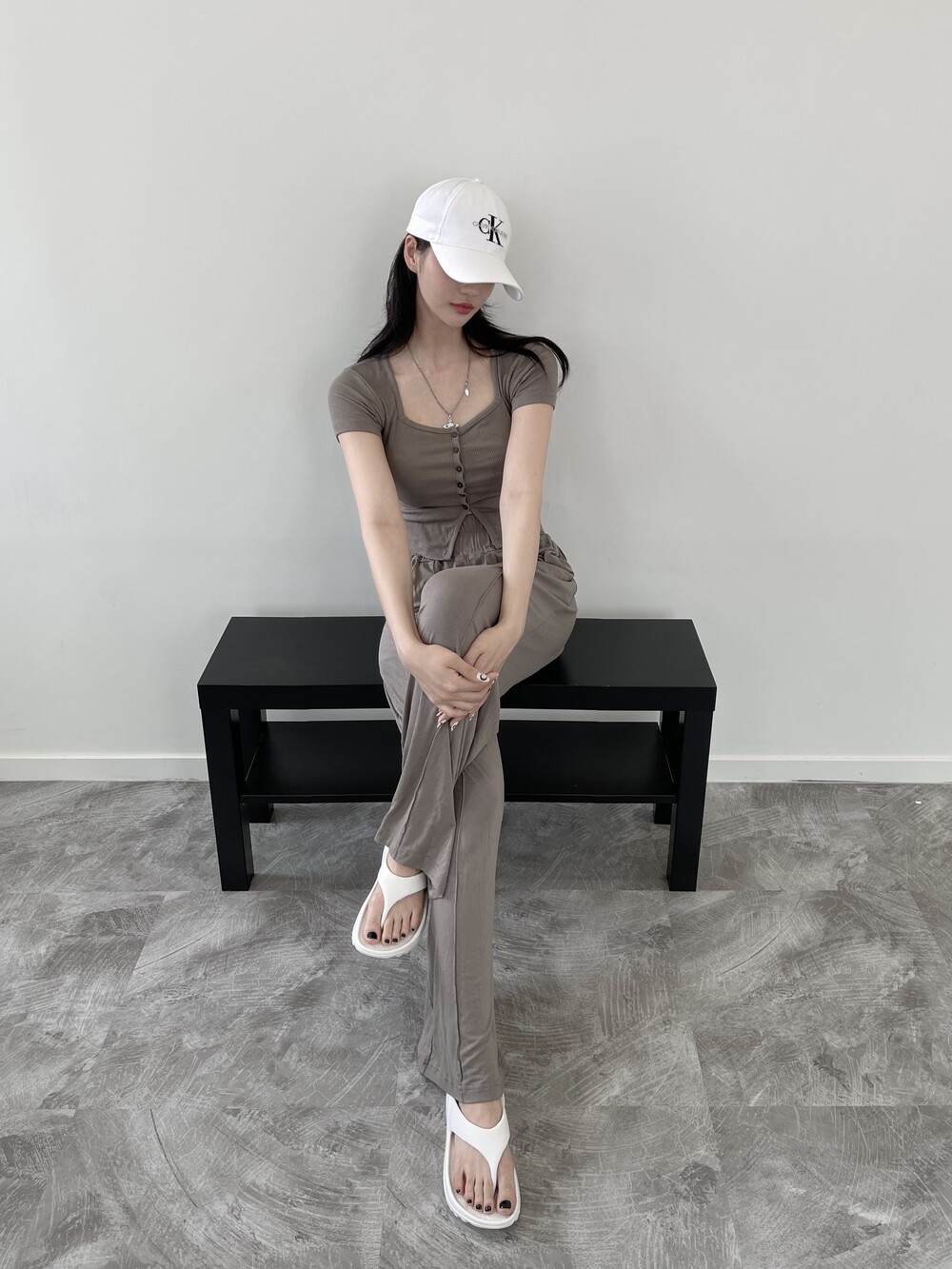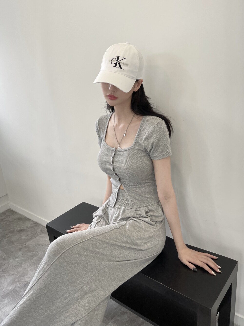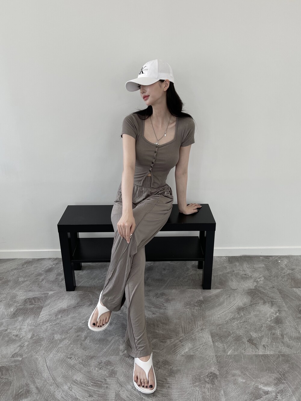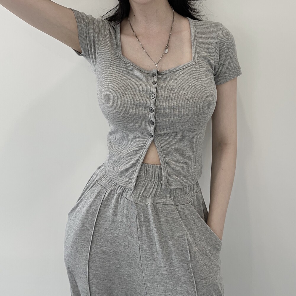 상의는 스퀘어넥, 버튼, 트임 디테일로 포인트를 줬고 하의는 찰랑이는 맥시 디자인으로 세트매치