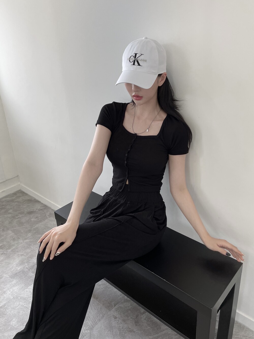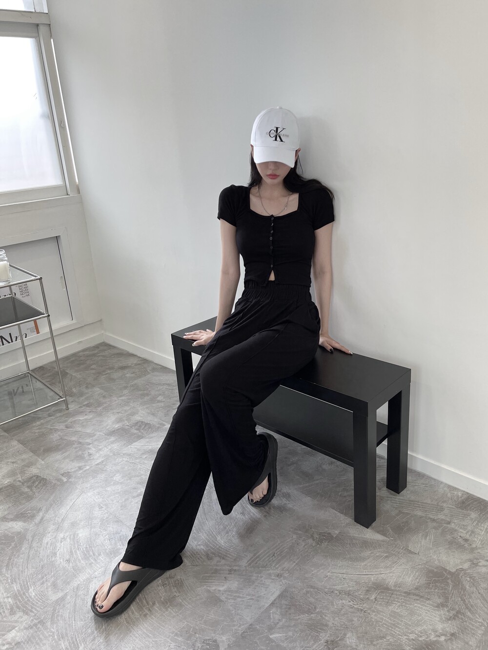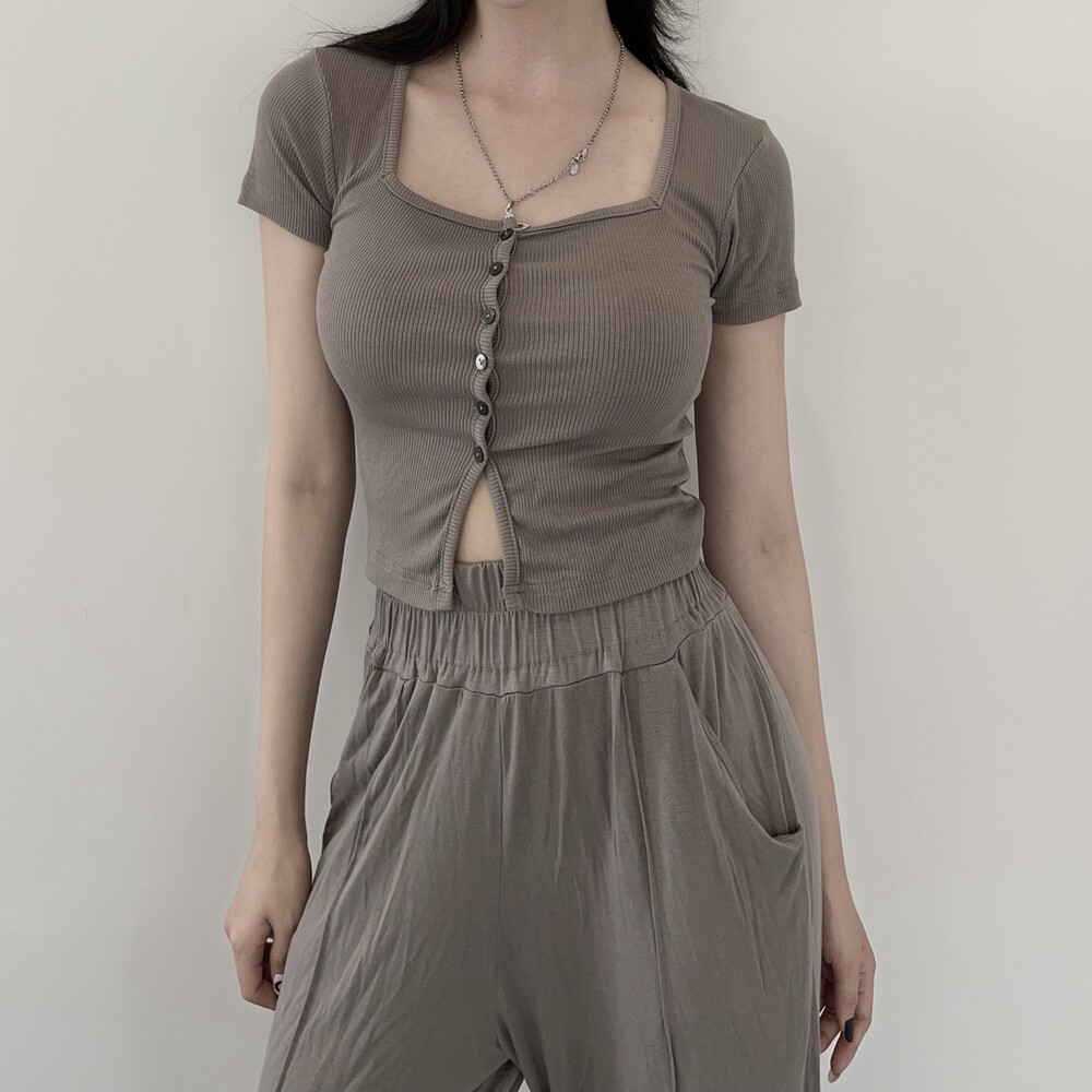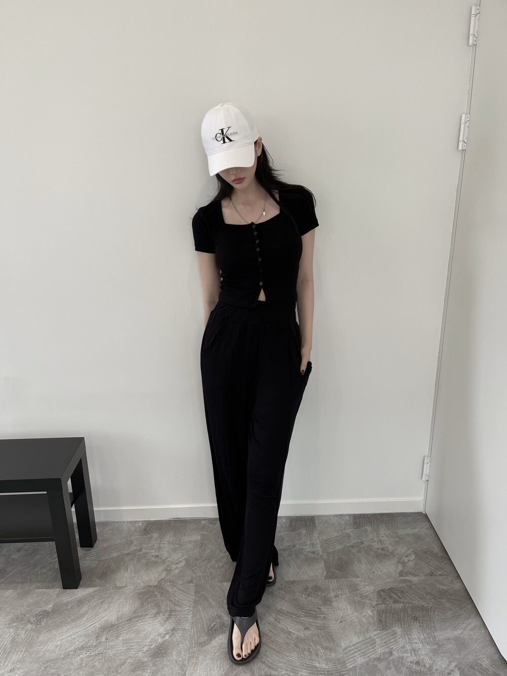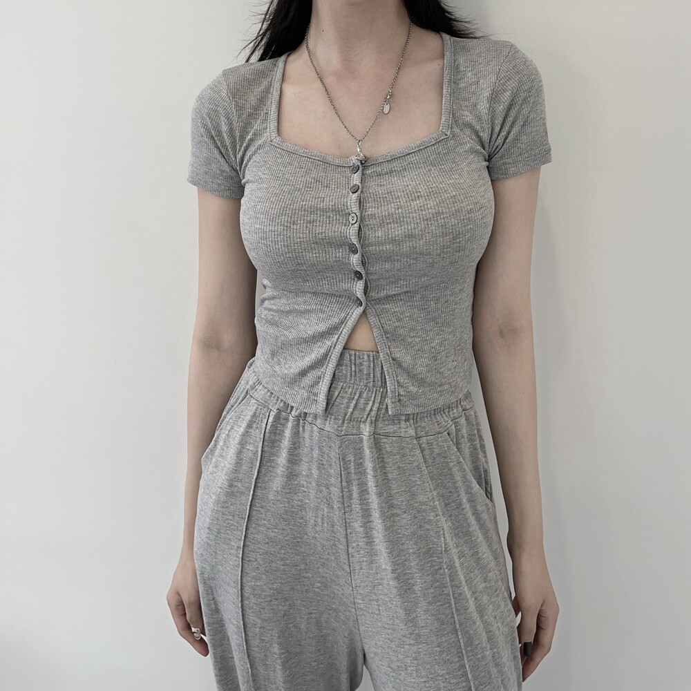 상의는 스퀘어넥, 버튼, 트임 디테일로 포인트를 줬고 하의는 찰랑이는 맥시 디자인으로 세트매치