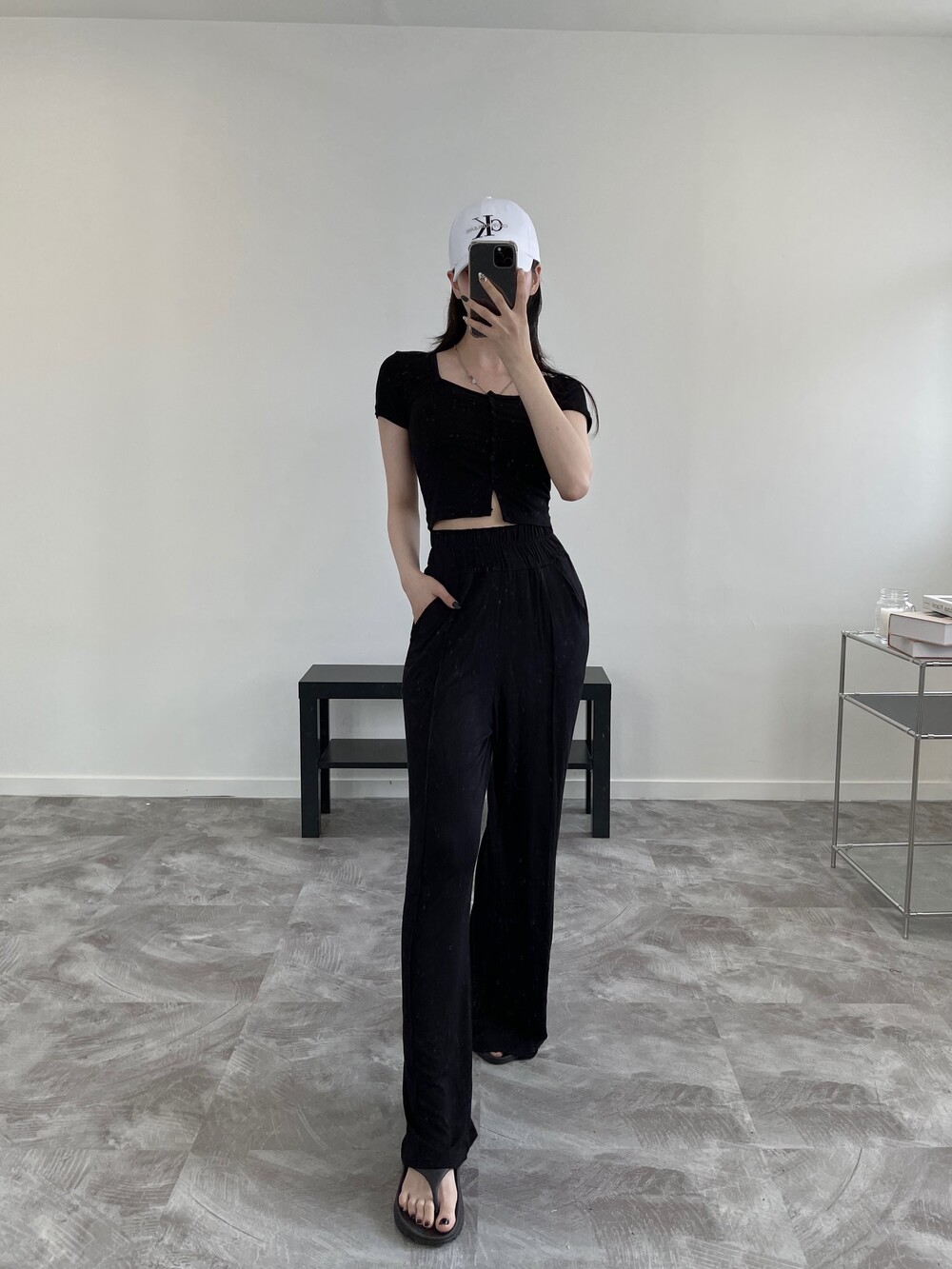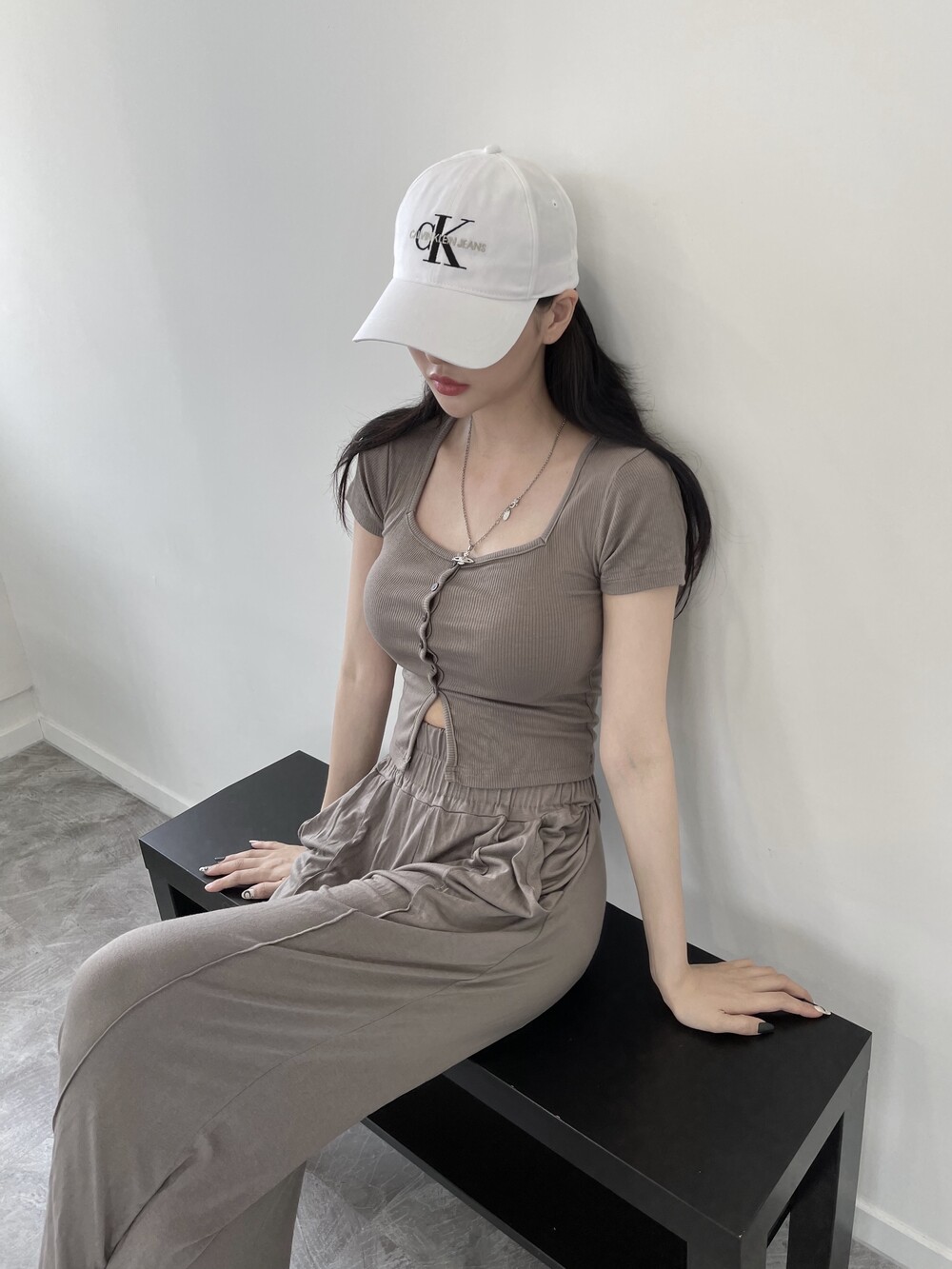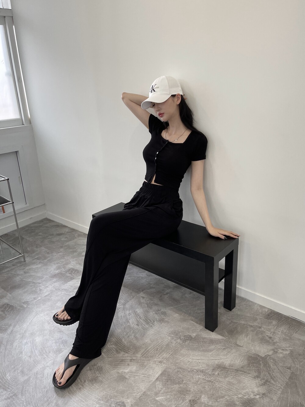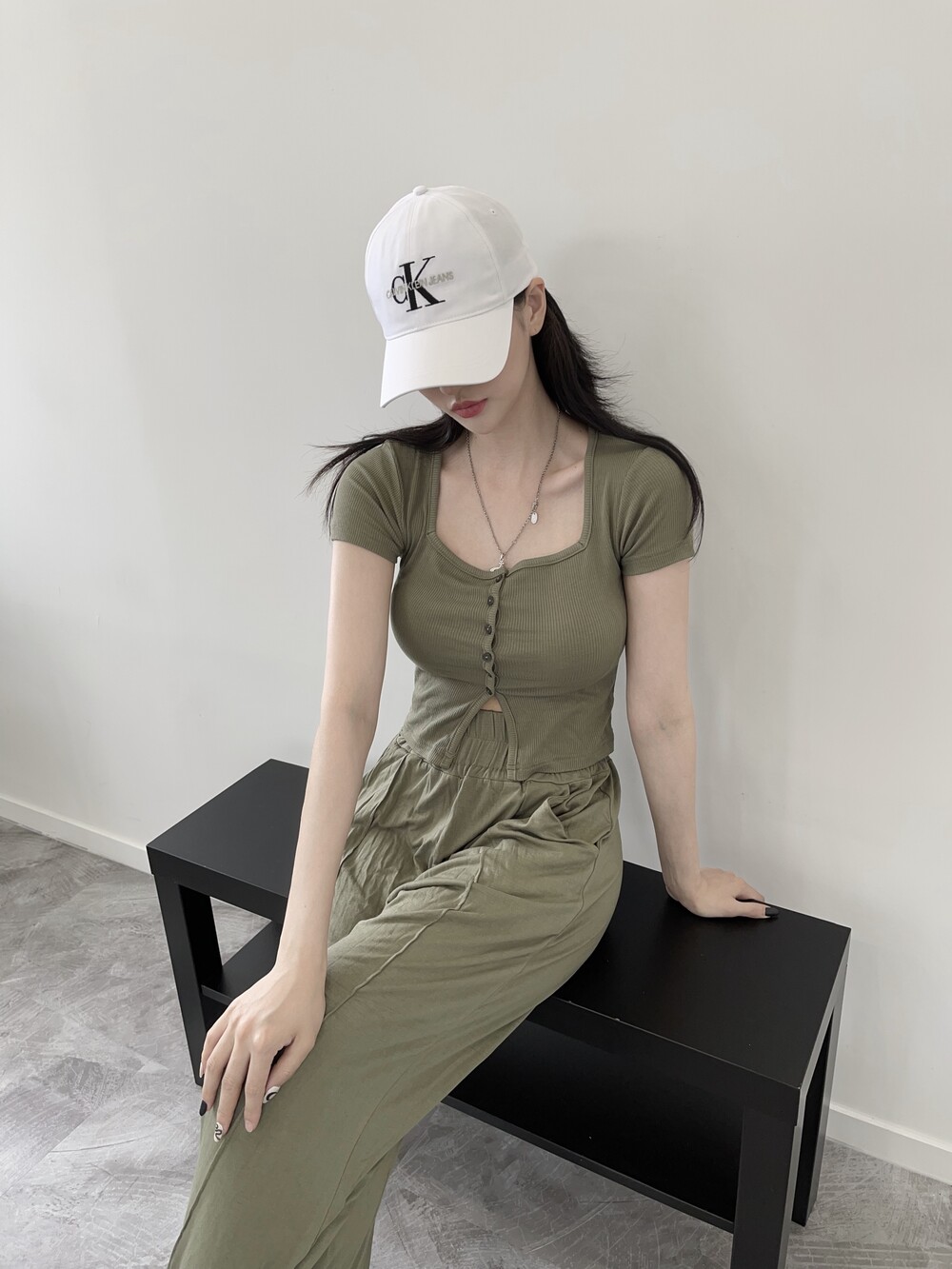 상의는 스퀘어넥, 버튼, 트임 디테일로 포인트를 줬고 하의는 찰랑이는 맥시 디자인으로 세트매치