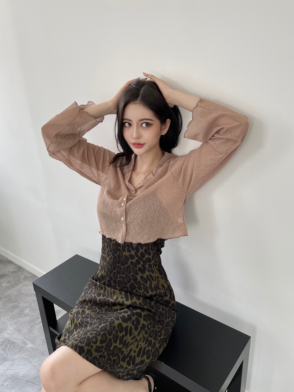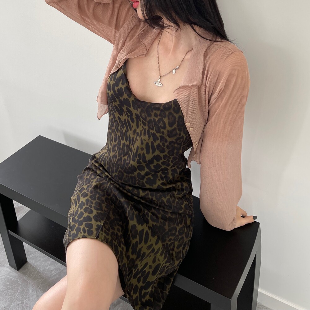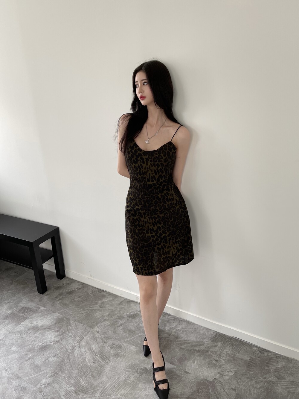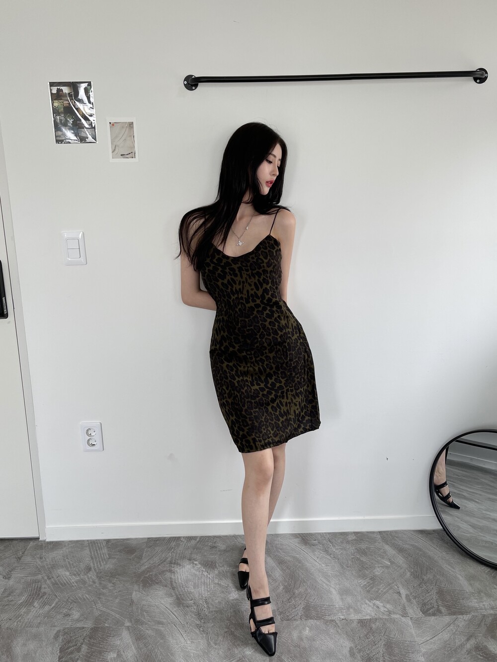 레오파드 패턴의 끈나시 스트랩 리본 원피스
